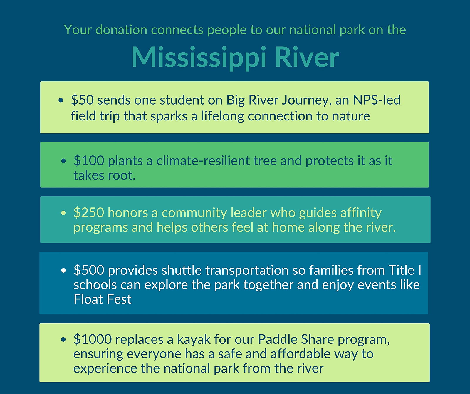 On Give to the Max Day, your gift to Mississippi Park Connection helps protect this vital river corridor and ensure that everyone—no matter their background—can experience the wonder of the Mississippi. From restoring floodplain forests to connecting youth with nature, your support fuels the work of the National Park Service that keeps this park vibrant, resilient, and welcoming.