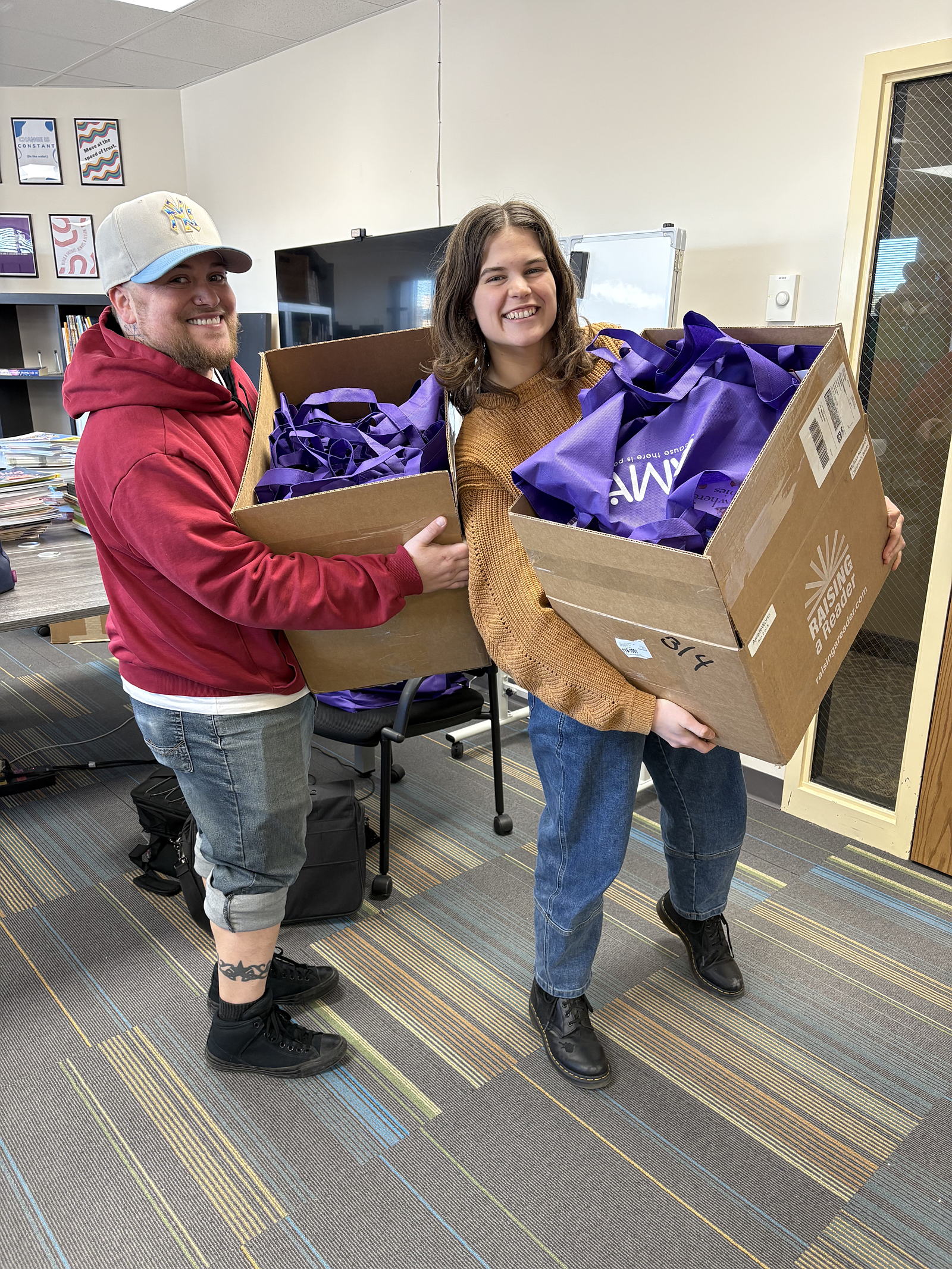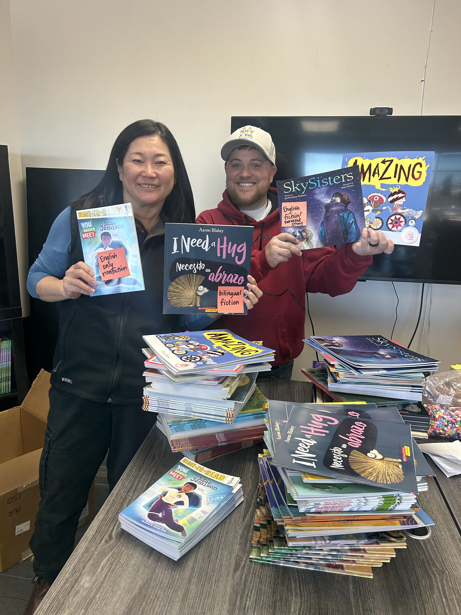 AmazeWorks needs your help distributing Belonging Book Bags to 600 Minneapolis families sheltering in place due to the ICE occupation. We’re providing AmazeWorks families with identity-affirming stories to counter harmful messages about our immigrant neighbors, bringing belonging directly into their homes. Rebecca and Ryan posing with book donations