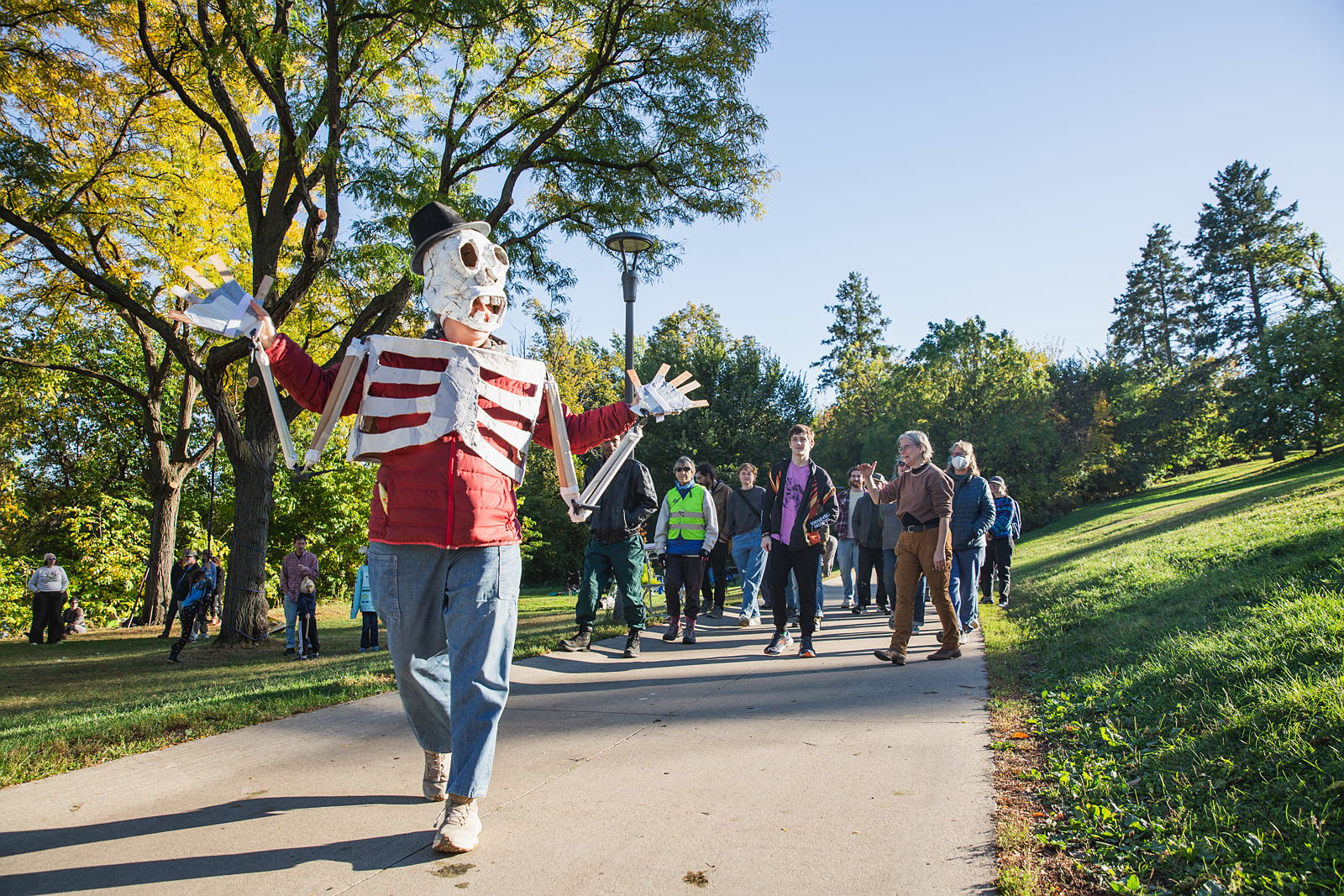BareBones Productions is a community-based, tenacious little Minneapolis performing arts non-profit, incorporated in 2000. OurMission is “To bring art into community and community into art through movement, puppetry and spectacle performance; creative re-use, education, and collaboration.” We succeed as an exuberant mix of semi-polished and pro-level artists and organizers to produce spectacular outdoor performances and parade sections, generally involving giant puppets, stilters, and bikes. Our main production is the annual “Halloween Outdoor Puppet Extravaganza”, a magnificent and mysterious festival-pageant that is part community theater and part public ritual, now in it's thirty-second season. 32 Years!