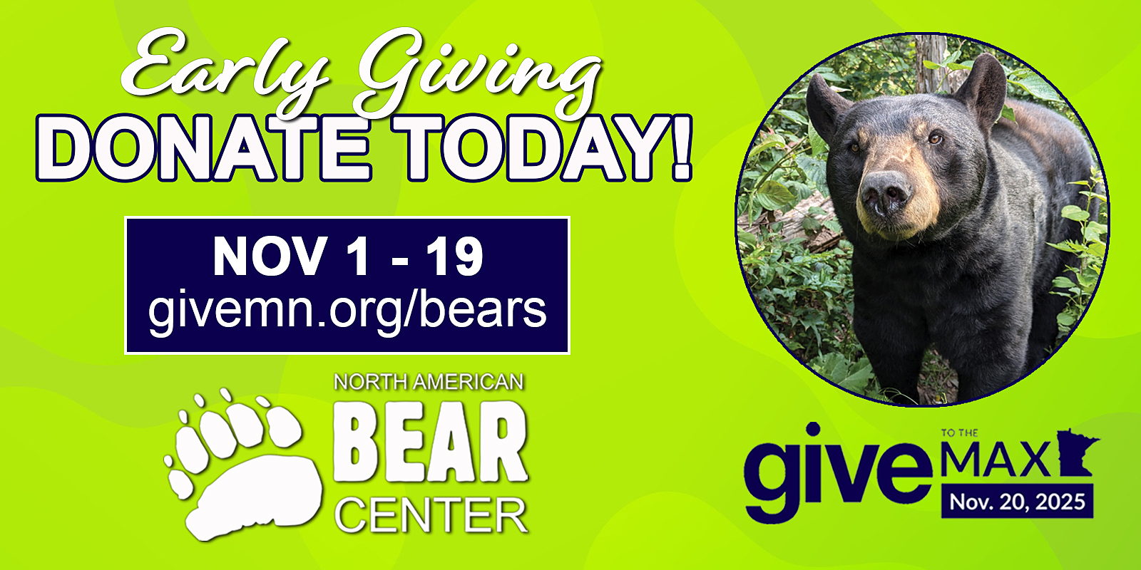 We are so thankful for your generosity over the past several years during the Give to the Max Day. Without your support we could not have made so many of the needed improvements to the Bear Center, including the new fencing and habitats for our bears, the pond renovation, a new cub room where children can learn and play, helping to complete the Northwoods Ecology Hall, and building of our Intern Housing Complex. All of the donations we receive through Give to the Max Day go towards long-lasting capital improvements to the Bear Center. We rely on your support during this campaign and we thank you!