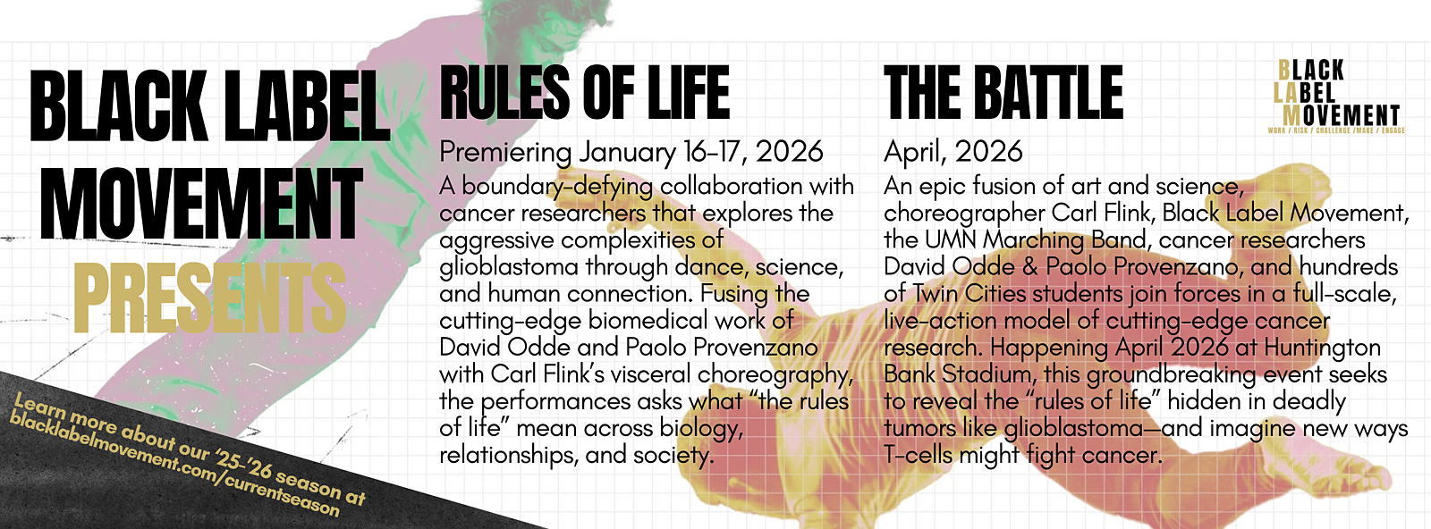 ‘The Battle’ is a spectacular fusion of art and science, will bring together choreographer Carl Flink, Black Label Movement, the University of Minnesota Marching Band Led by director Betsy McCann, cancer researchers David Odde and Paolo Provenzano and their labs, and hundreds of Twin Cities students to launch a full-scale, live-action model of groundbreaking cancer research. Happening April 2026 at Huntington Bank Stadium, this epic scale working research model aims to decode “the rules of life” hidden within deadly tumors like glioblastoma by visualizing how t-cells might better fight cancer. Powered by the innovative Bodystorming system (www.bodystormingsystem.com), this dynamic project won’t just communicate science—it will do science, pushing the boundaries of research and performance alike.