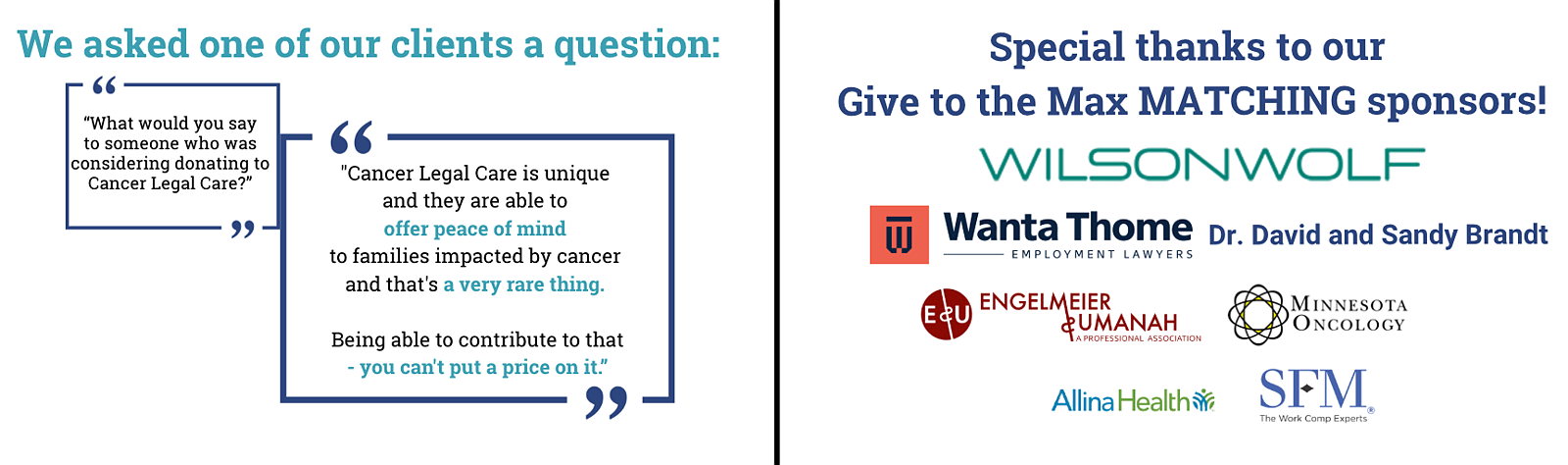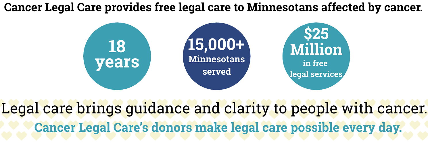 The collective impact of our donor's generosity has resulted in over $25 million dollars in free legal care services to the Minnesota cancer community, directly impacting our clients' ability to: