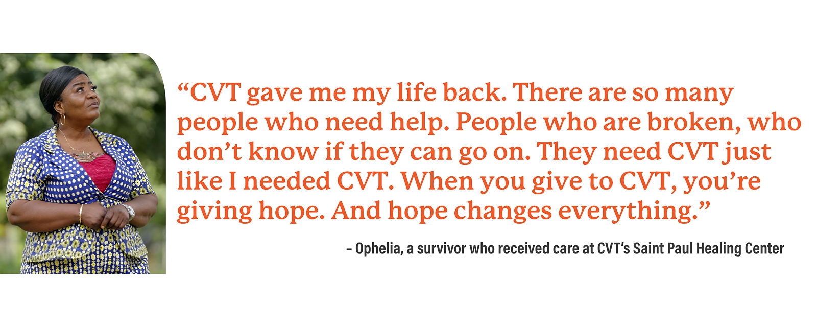 CVT was founded in 1985 in St. Paul. Torture survivors receive out-patient care at several locations, including our Healing Center in St. Paul. A team of healers provides holistic healing care through medical and nursing care, psychotherapy, social services and massage and physical therapy.