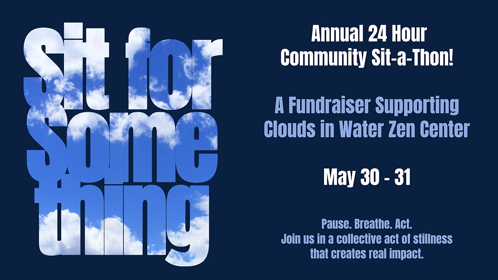 For 24 hours, our community will gather in meditation to raise support for the work of Clouds in Water Zen Center. Participants will sit, breathe, and dedicate their practice to something meaningful—peace, healing, justice, community, or the simple wish for a kinder world.