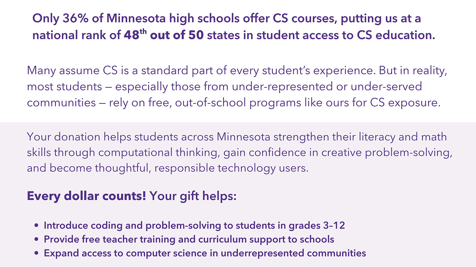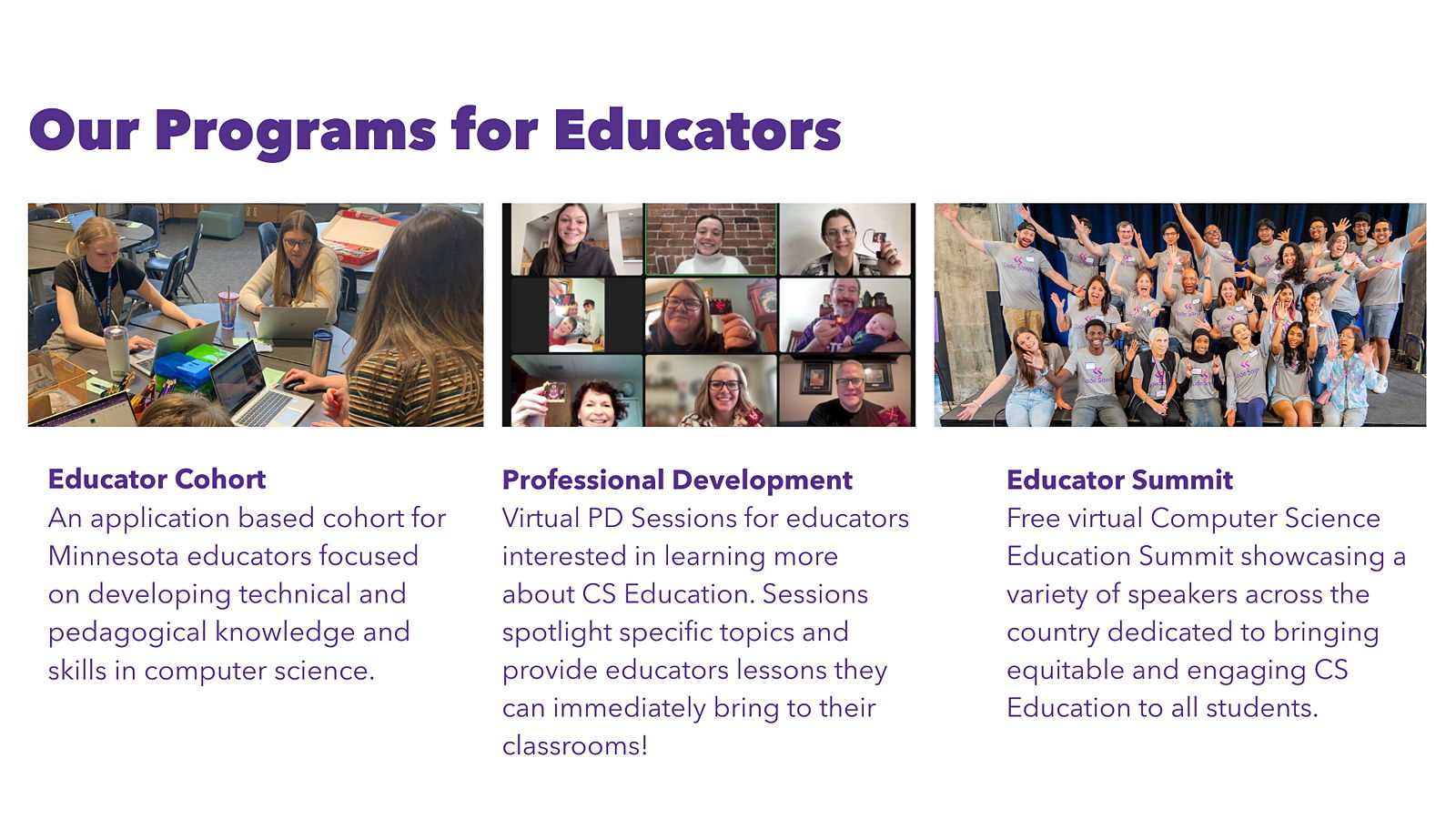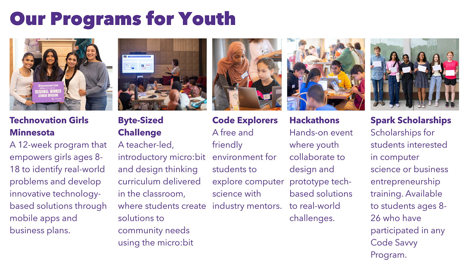 PROGRAMS: Technovation Girls Minnesota, Code Explorers, Byte-Sized Challenge, Spark Scholarships, Educator Professional Development