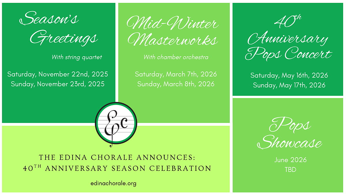Rehearsals have begun for the 2025-2026 season. This year, thanks your support, we will offer four events. Audience members can attend most concerts in person or via livestream. We will usher in the holiday season with a fall concert, Season's Greetings. In early March, we will present our Mid-Winter Masterworks, Hagenberg's Illuminare and Faure's Requiem, with chamber orchestra, organ, and soloists. Later in the spring, join us for a joyful celebration featuring highlights from past Pops concerts and the return of some familiar faces. As an encore to our season, enjoy a more intimate spotlight on the individual talents of The Edina Chorale through solos, duets, and small ensembles at our June Pops Showcase.