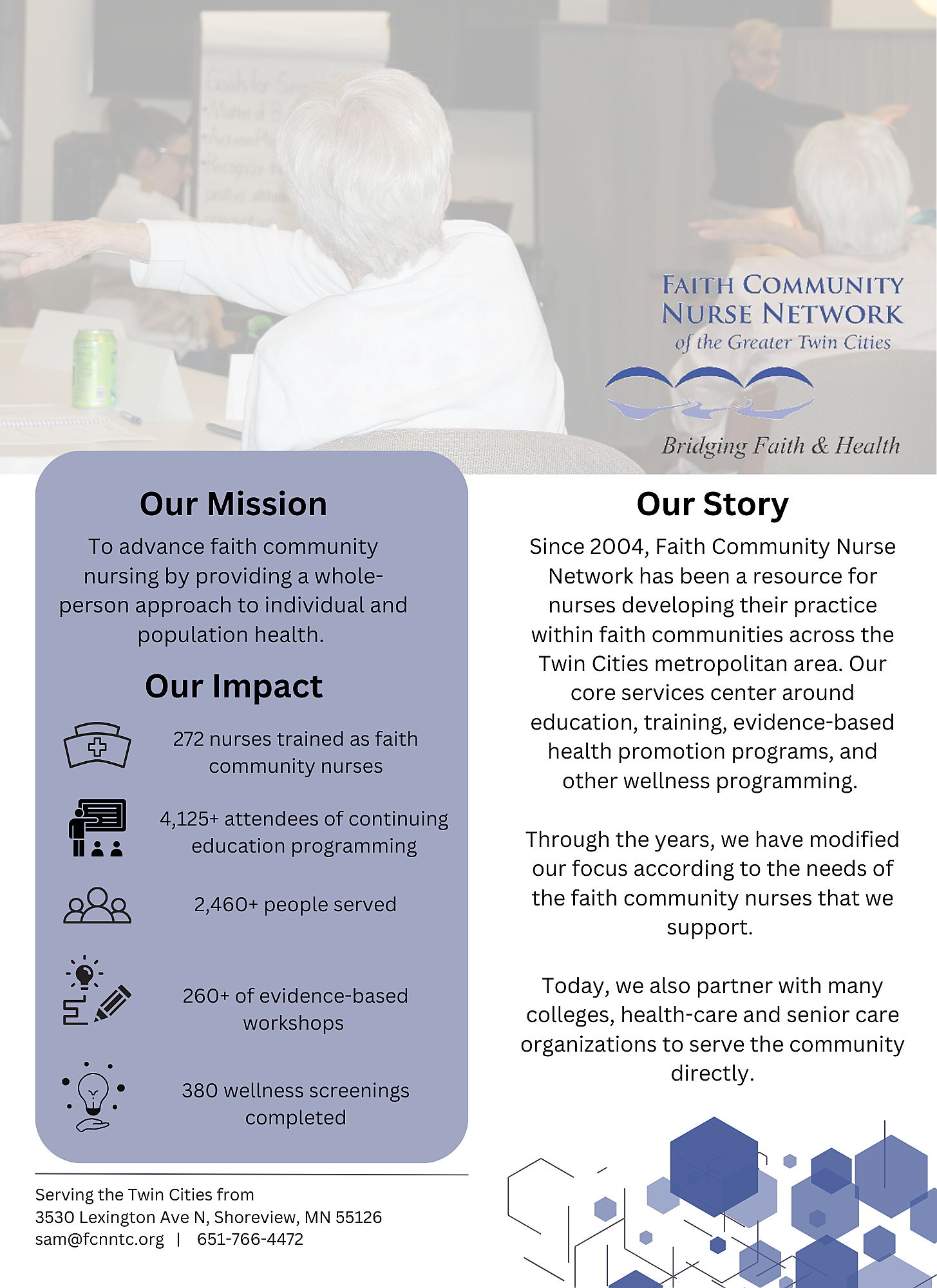 The Faith Community Nurse Network (FCNN) is an interfaith, service organization of and for faith community nurses. FCNN promotes the professional role of the faith community nurse and supports FCNs in Minnesota in order to strengthen outcomes of their nursing care.