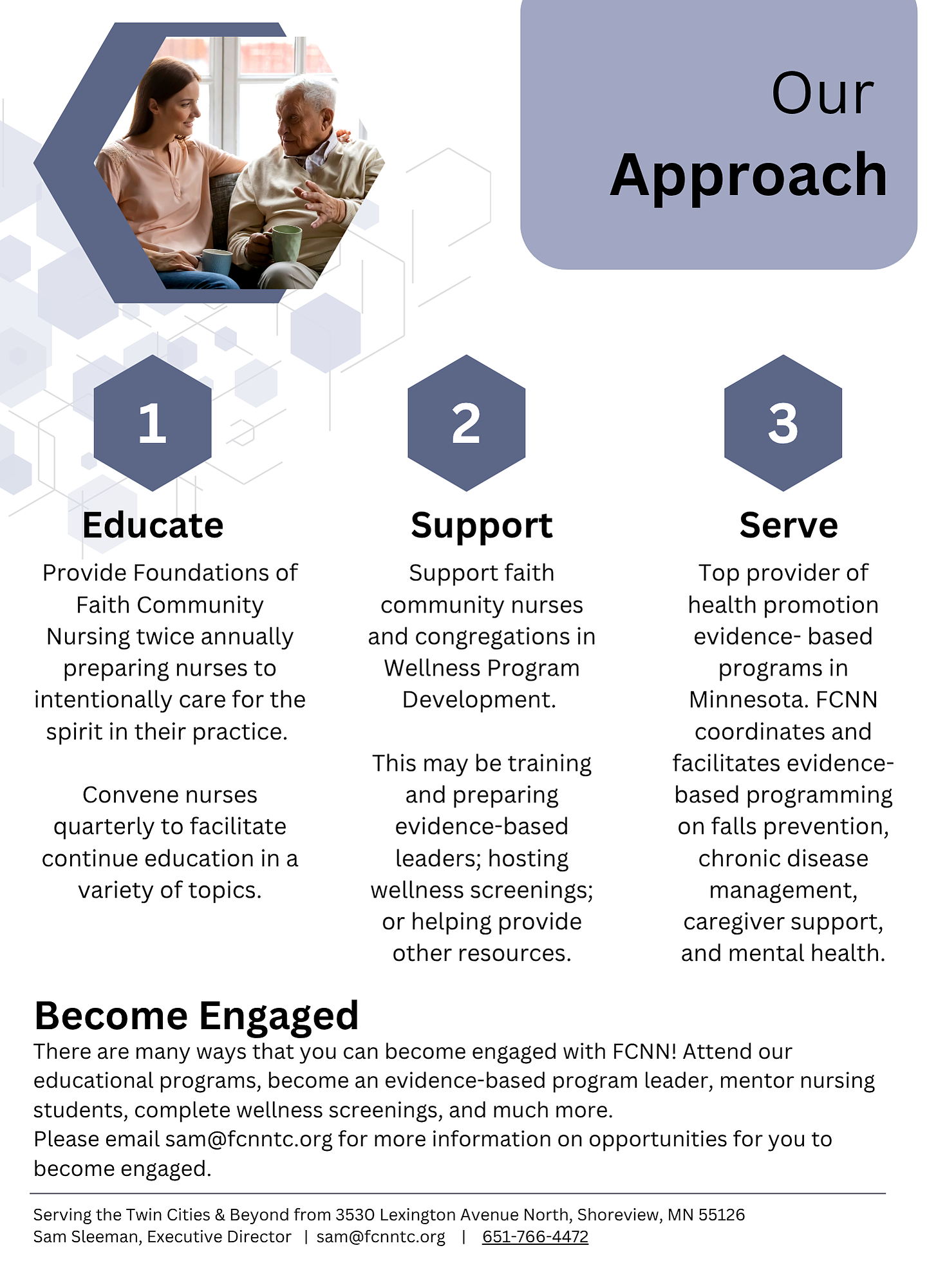 Faith community nurses provide high quality spiritual, physical, and emotional care right in our communities. Help support these incredible health care workers! Become Engaged Today: