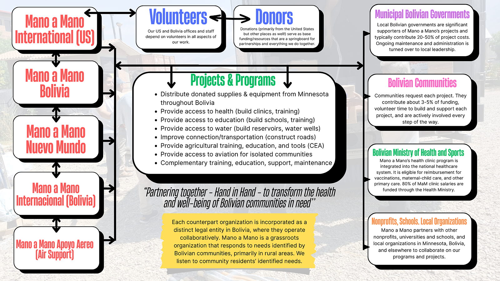 Your donation helps Mano a Mano ship donated supplies from the US and distribute them in Bolivia, which: