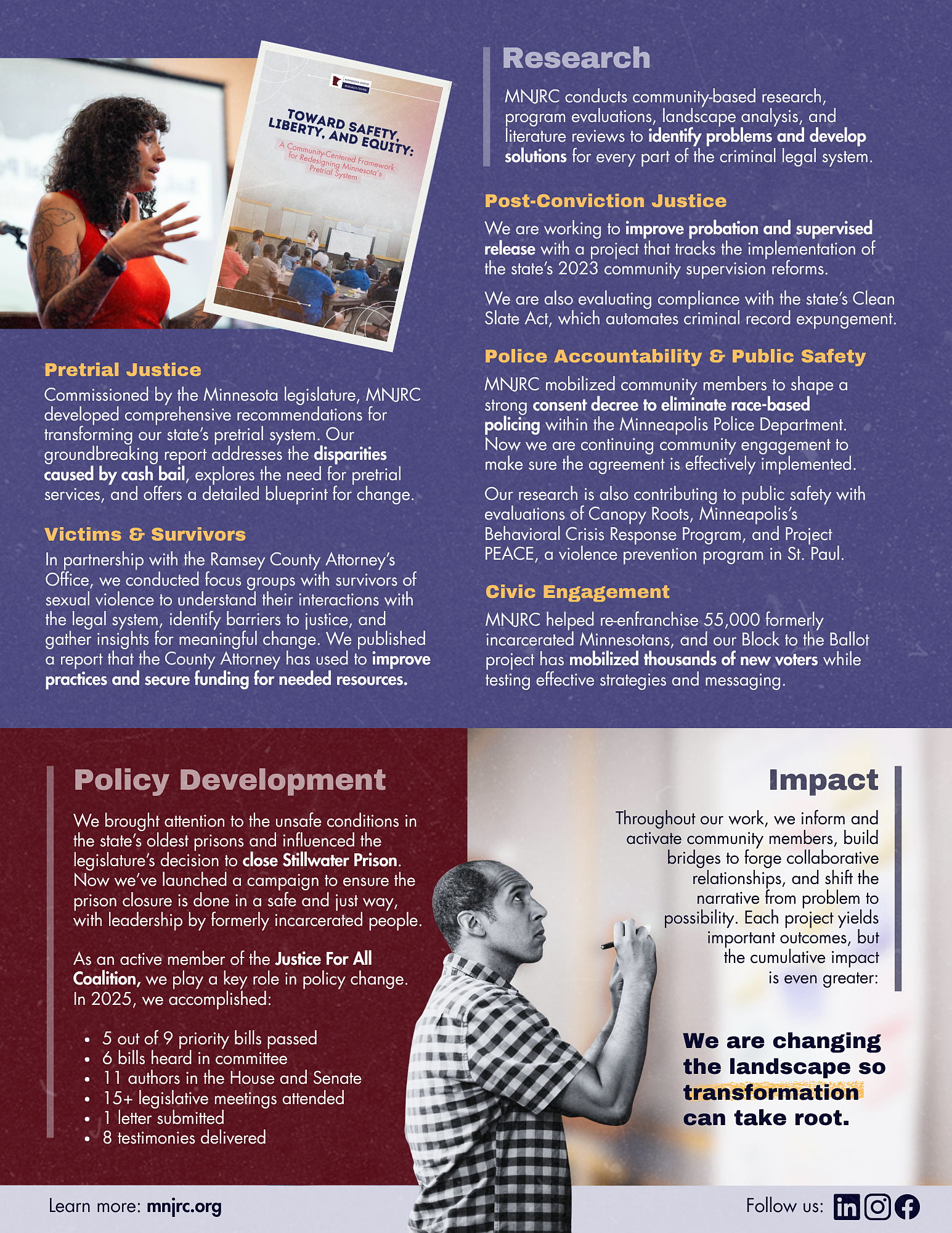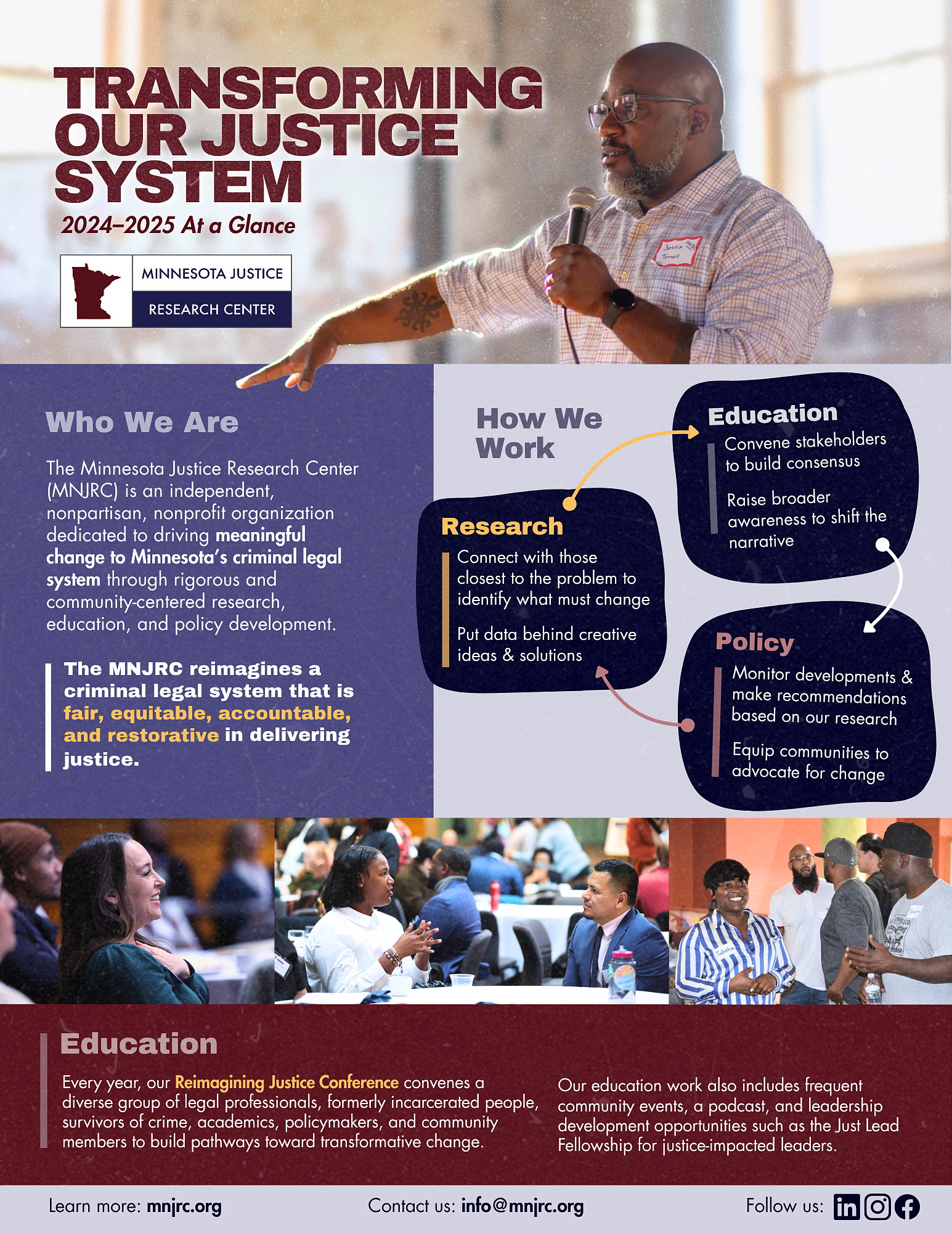 The Minnesota Justice Research Center is dedicated to transforming our state’s criminal legal system to be more equitable, accountable, and restorative in delivering justice and safety for all. We’re raising $25,000 by the end of the year — and our Give to the Max Day goal is $5,000!