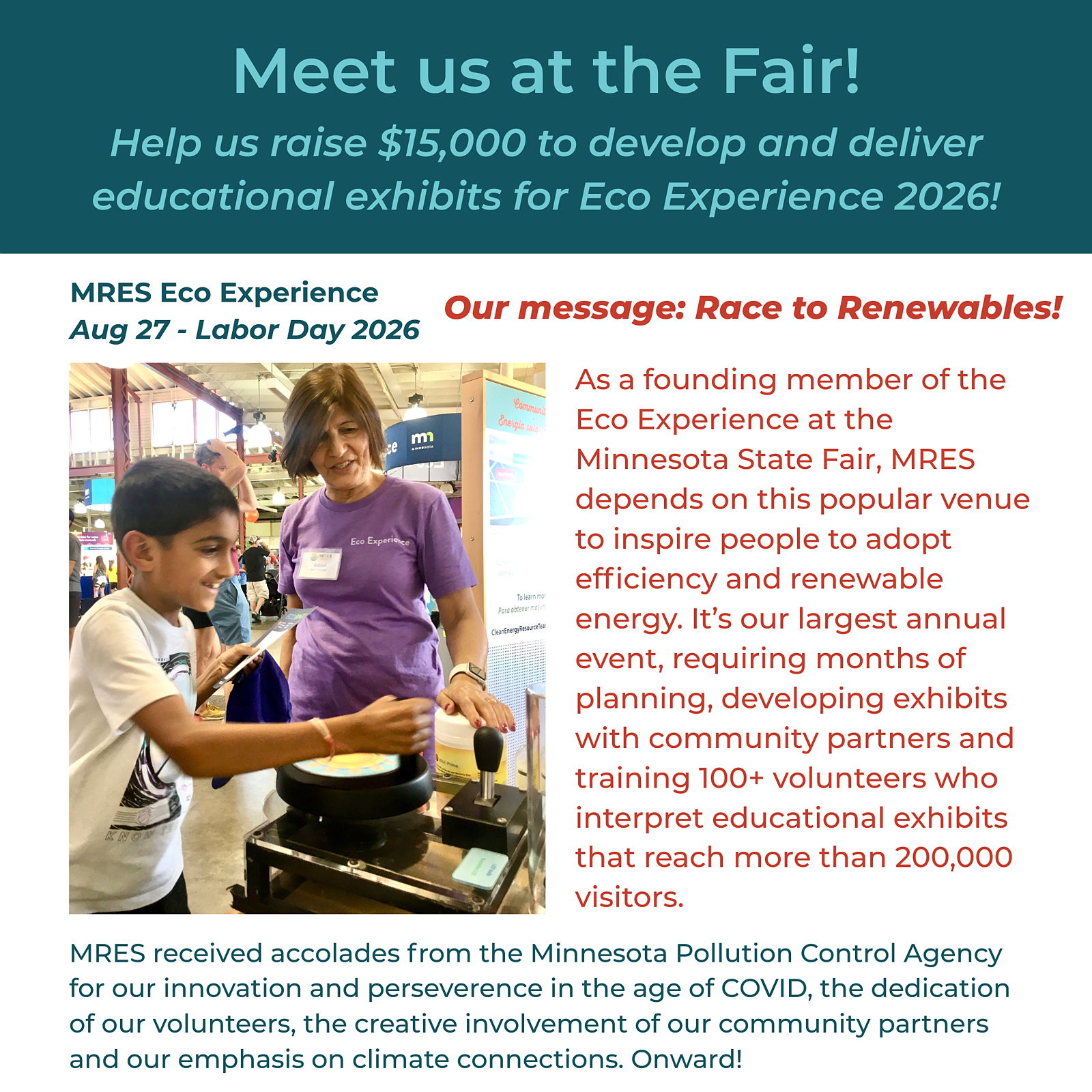 Eco Experience — MRES exhibits at the MN State Fair to educate the general public about the different sources of renewable energy and how increased household efficiency can save you money. In 2025 we displayed the different sources of renewable energy such as solar, wind and storage. Efficient Air Source and Ground Source heat pumps were displayed.