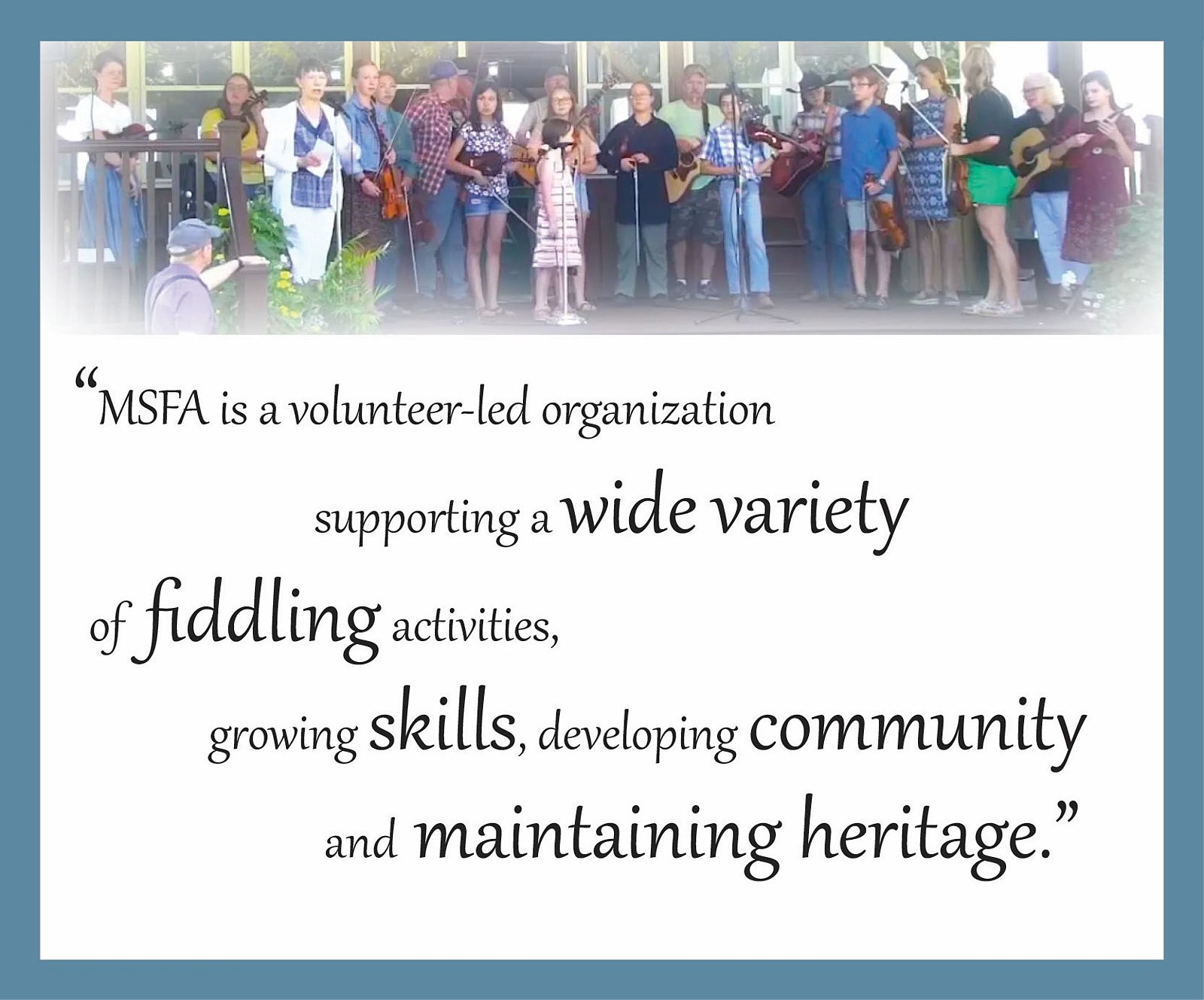 Today, in addition to contests, the over 140 members of the MSFA support educational workshops, jam sessions, youth programs, historical demonstrations and any other activities that promote the popularity of old time fiddling and the heritage of Minnesota folk music.