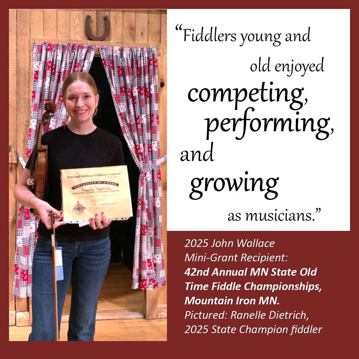 The MSFA John Wallace Mini Grant program has sponsored fiddle contests and workshops as well as offered scholarships for fiddlers attending other fiddle workshops or camps.