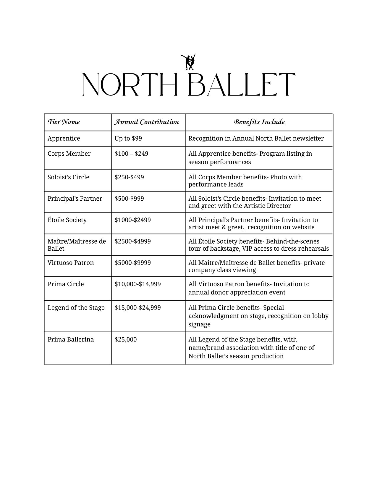 Your generous support helps fund performances, provide scholarships, and create accessible performances in the local community. Whether you're an individual patron, family, or business, we invite you to join the North Ballet team through one of our donor tiers.