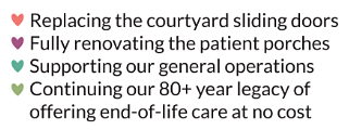 Contributions made in November will give us the resources we need to renovate our PORCHES in our courtyard, plus grow our general operating funds. Not only will your support ultimately improve patient and family care, but every gift will be MATCHED by two $50,000 grants from two Our Lady of Peace generous donors ALL month long.