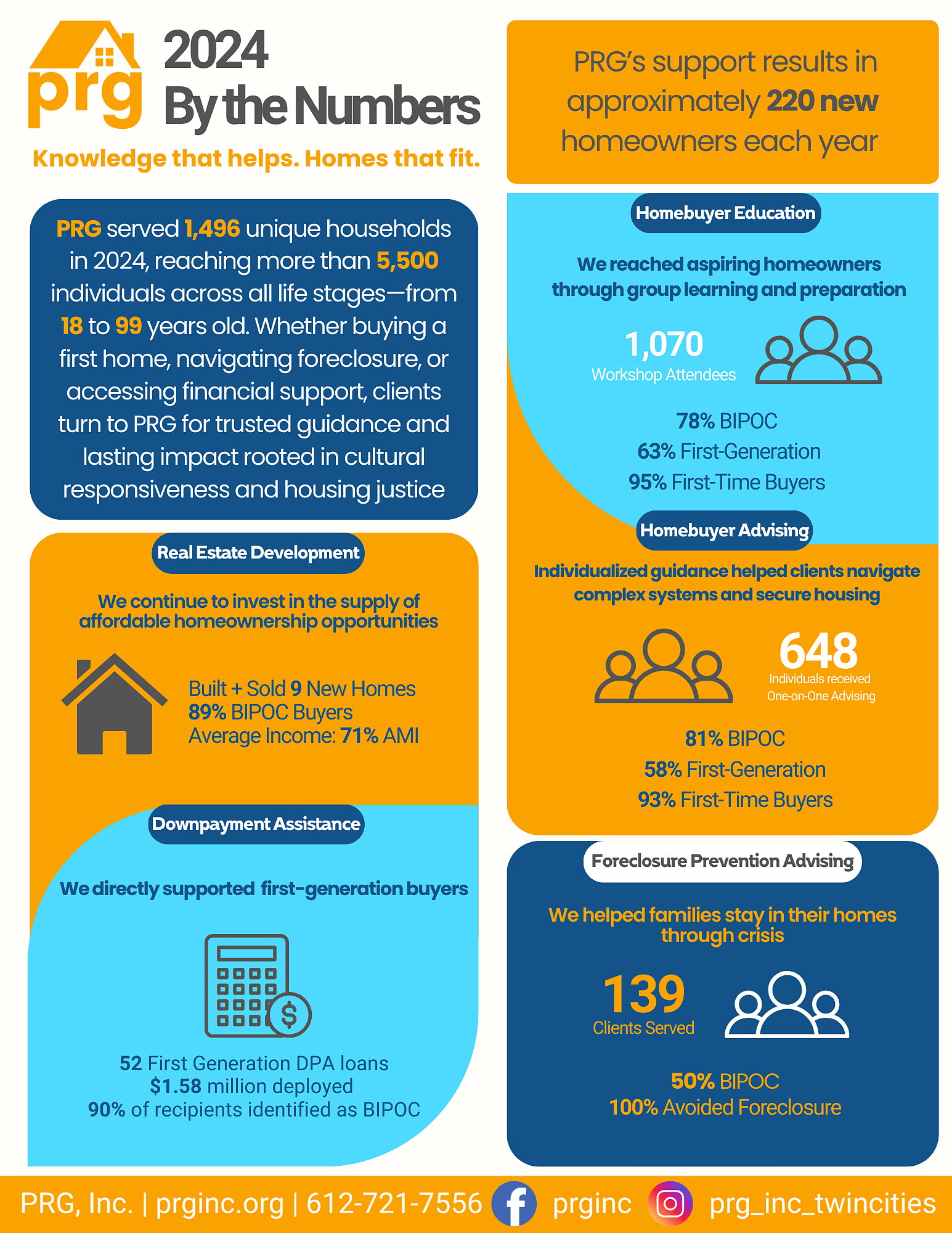 Through prepurchase education and one-on-one advising, PRG supported 1,496 households on their path to homeownership in 2024, reaching over 5,500 individuals across the Twin Cities. We provided group workshops, personalized advising, and practical tools that helped first-time and first-generation buyers navigate the complex homebuying process with confidence. These services create momentum for wealth-building across entire families and communities.