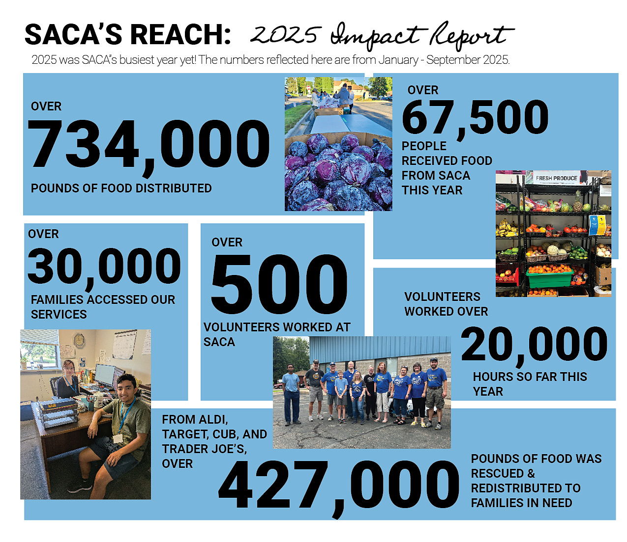 SACA Food Shelf and Thrift Store provides food and other basic needs items to individuals and families in Columbia Heights, Northeast Minneapolis, and surrounding communities. Last year, we distributed over 900,000 pounds of food to our neighbors. Our mission is to provide food and resources to those in need while empowering dignity and independence.