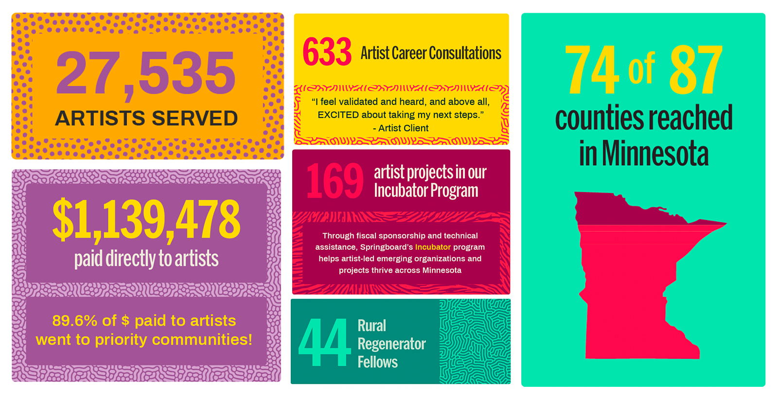 Last year alone, Springboard served over 27,000 artists in 74 of Minnesota’s 87 counties and paid over $1.1 million directly to artists (nearly a quarter of our budget!) through artist project fees, micro-grants, fellowships, and guaranteed income payments.