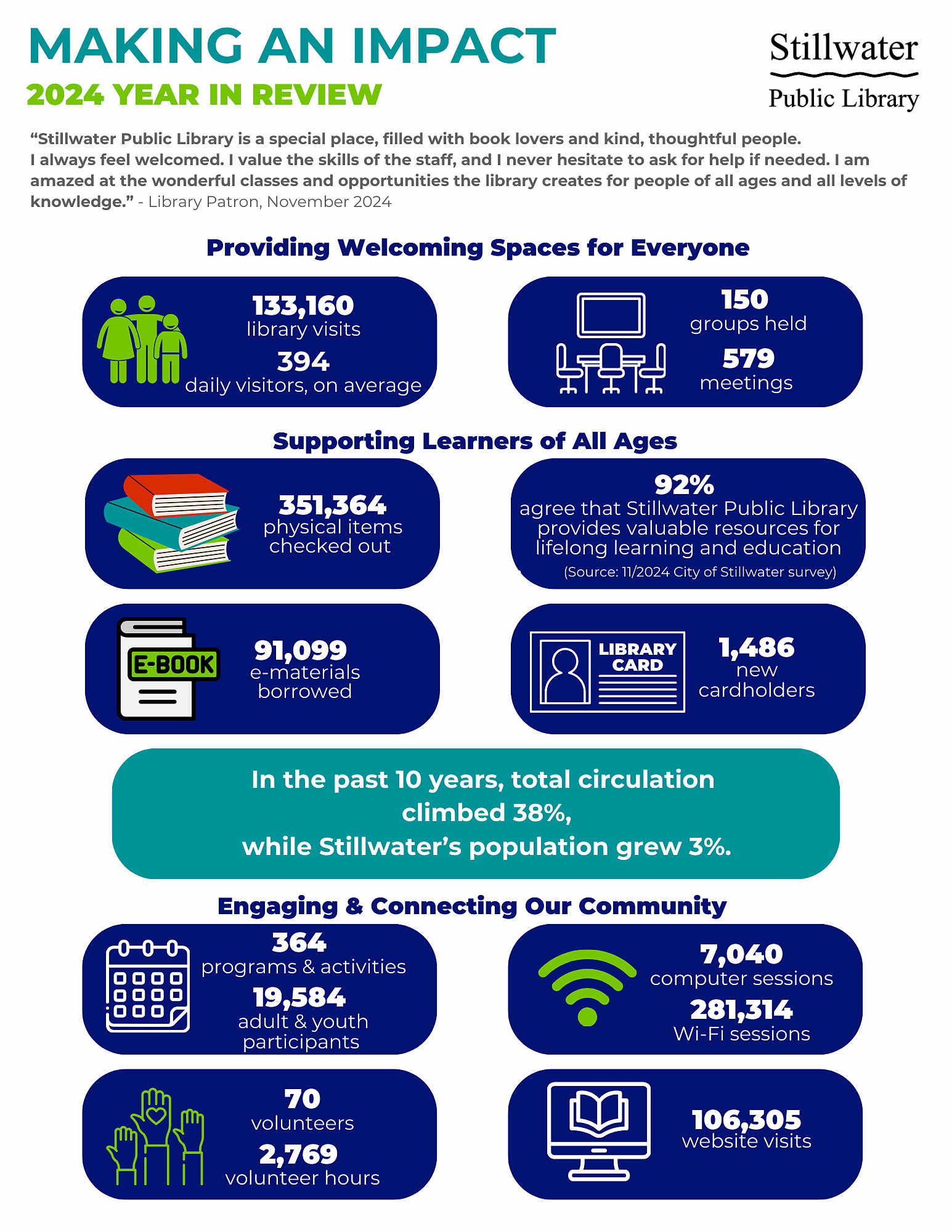 The library continues to grow and serves as a vital community resource. It is inclusive, accessible, and welcomes everyone. The Stillwater Public Library is an essential education partner, promoting early literacy, and student academic success. Library programs build community for patrons of all ages. Additionally, the library supports job seekers by providing technology and career resources.