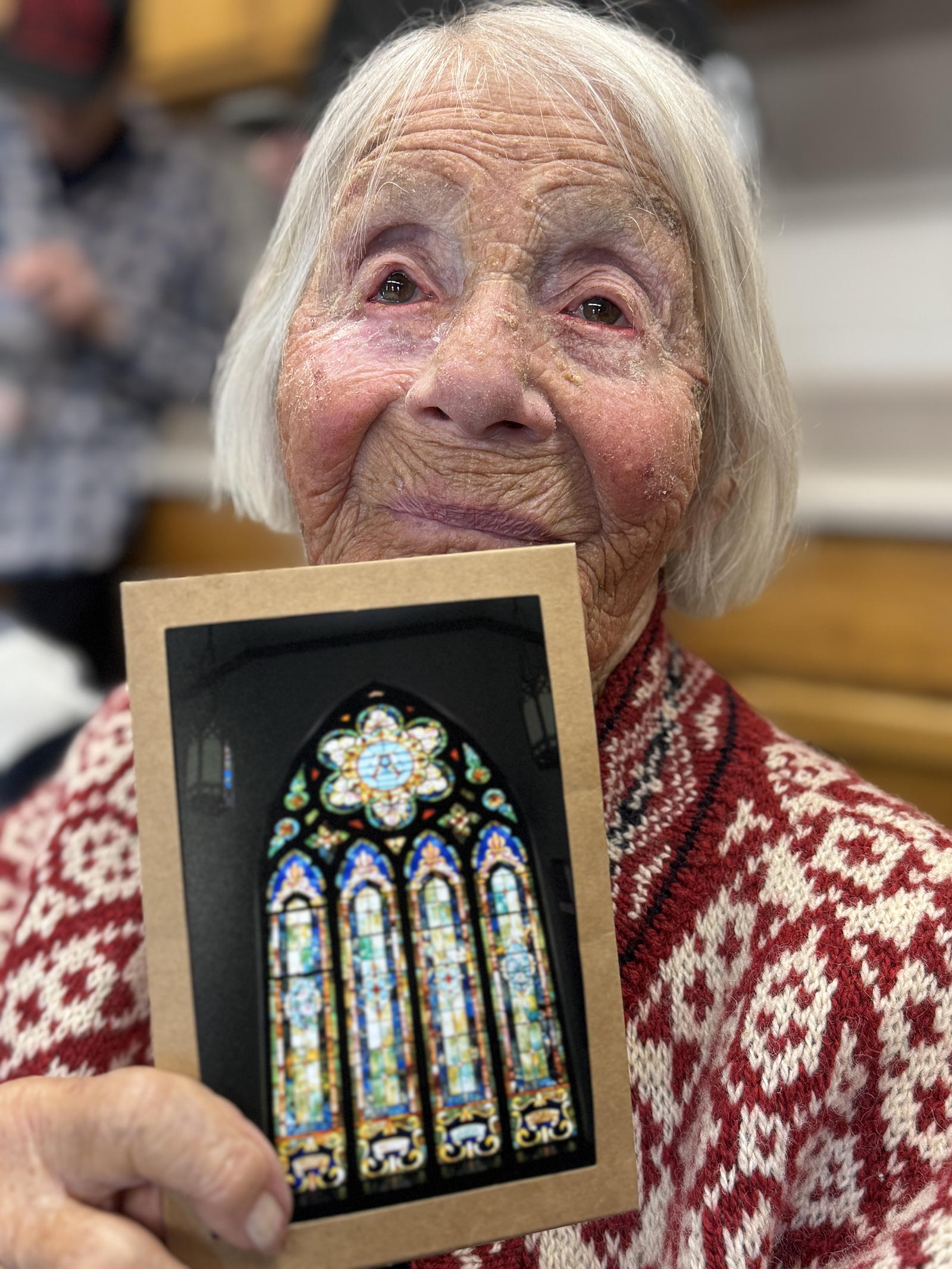 Vi made a photograph of the stained glass window in her church for a letter she wrote to her twin sister. She participated in one of the many workshops we conducted using cameras and writing with people of all ages.
