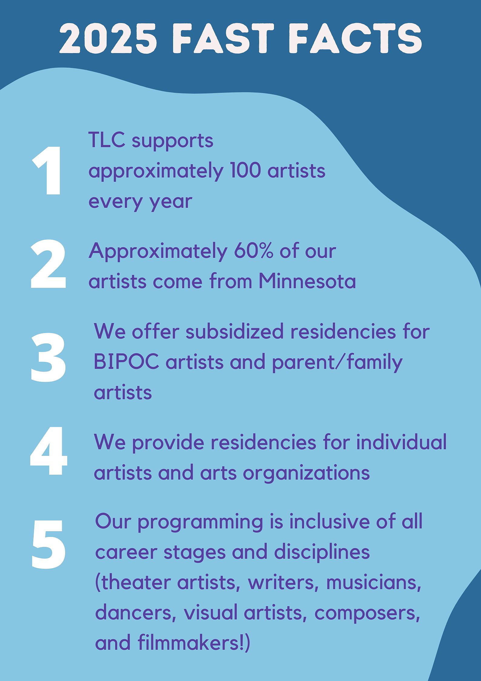 We hope that you share our belief that supporting artists is essential. Like many non-profit organizations, TLC has been rocked by changes impacting funders, foundations, grant makers, and individual donors. We recognize that we are all collectively living through a period of incredible disruption, and we see the toll this disruption is having on the artists we serve. In 2025 we provided approximately 100 resident artists the opportunity to center their work and nurture their spirit. Help us make a tangible difference in the lives of 100 more deserving artists in 2026 with a gift today.