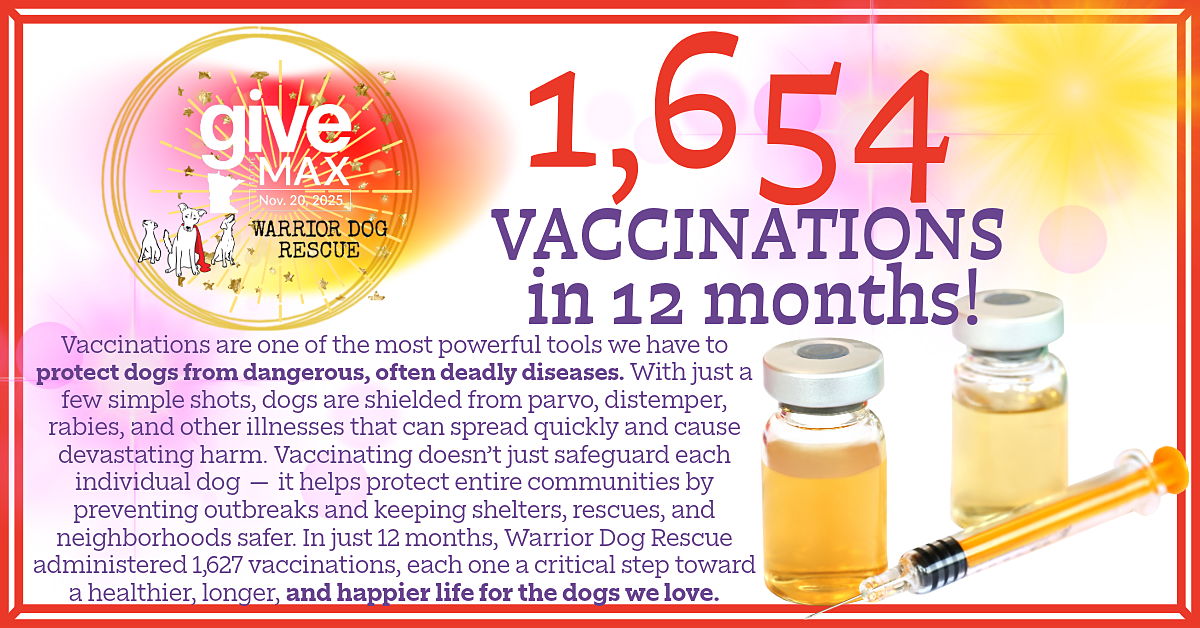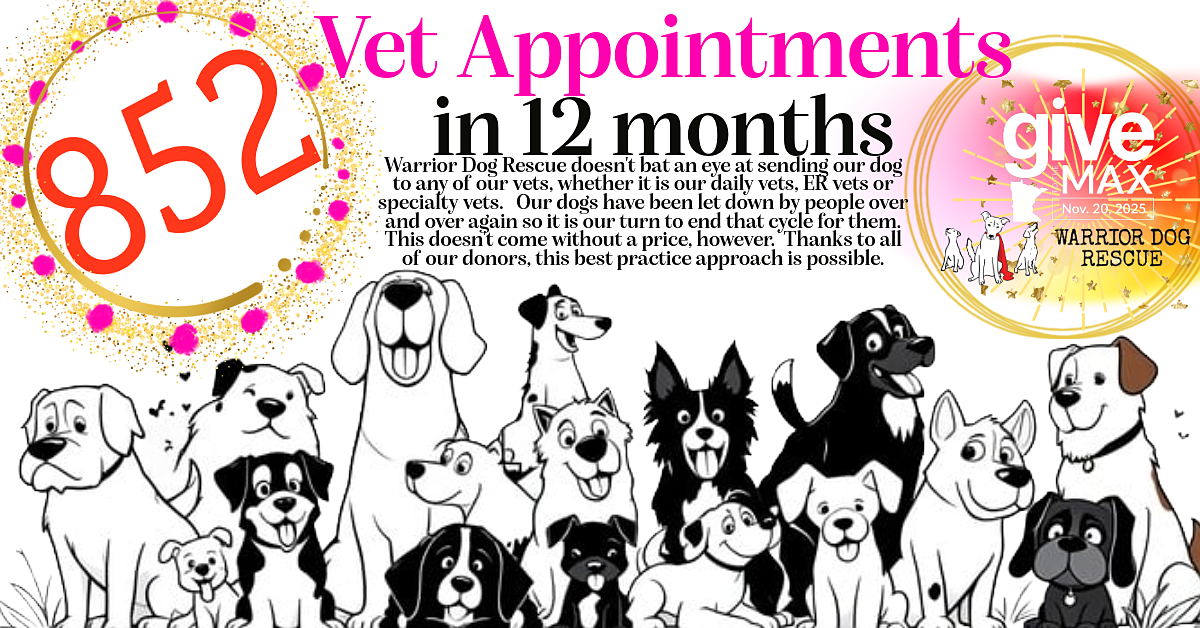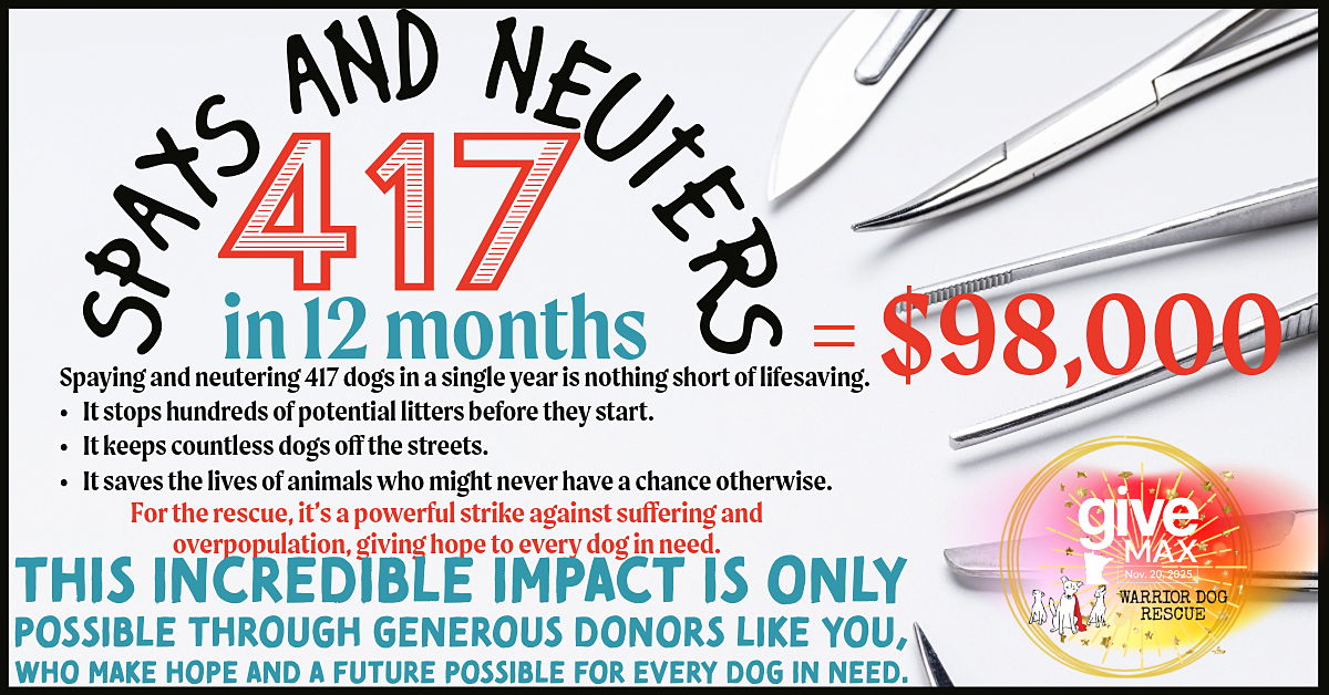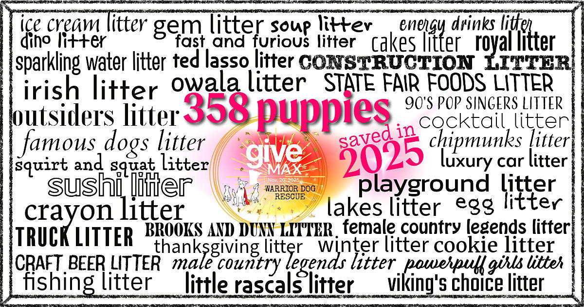 In 2025, Warrior Dog Rescue has been able to say "yes" to 523 dogs and since our start in 2017, Warrior Dog has saved 4,282 dogs with vet bills totaling over 2,000,000 spanning our years of rescue.