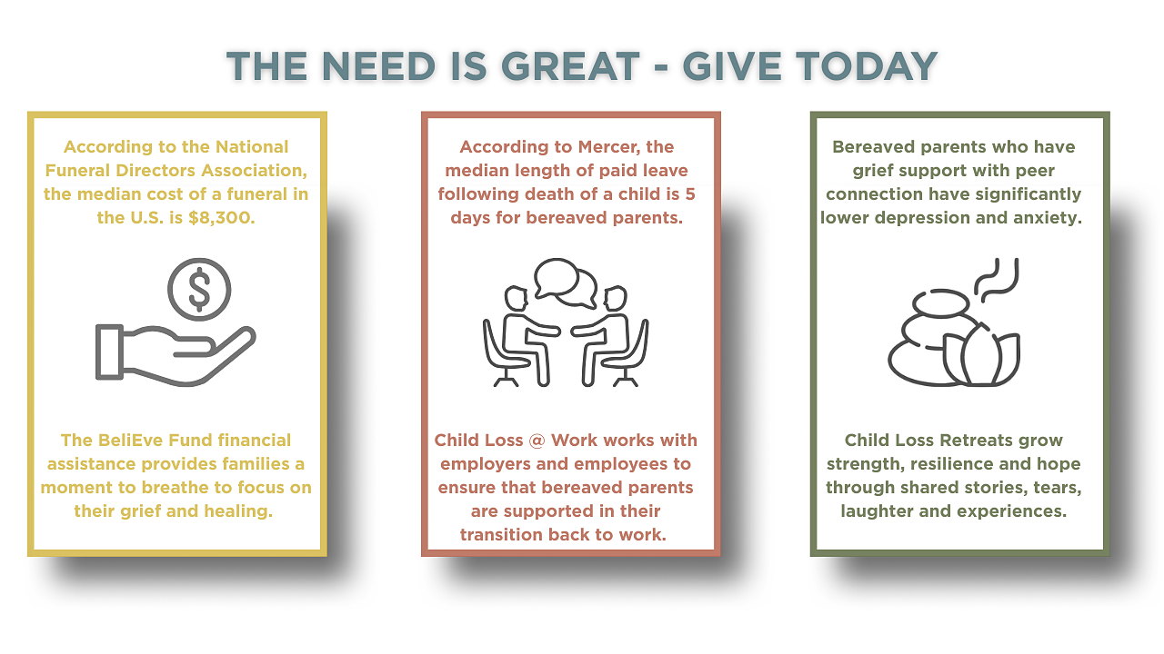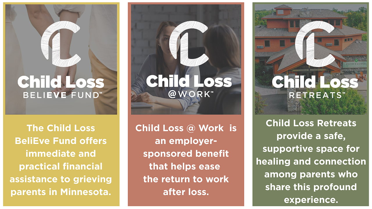 Faith's Lodge and The BeliEve Foundation were both founded by bereaved parents looking for healing and grief support. These two organizations saw a chance to unite, to not only help more grieving families, but to provide them with a more streamlined, and complete grief support. From immediate financial assistance, to support transitioning back to work, to finding community, connections and healing at retreats, the Child Loss Foundation is there for bereaved families every step of the way.