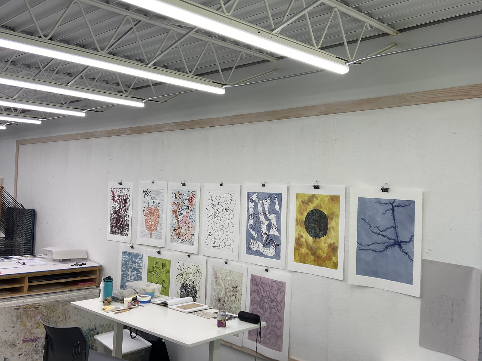 The print studio is a dream studio. Plenty of work space and a large Takach press. To have uninterrupted time to work out ideas and let your imagination run wild is a real luxury for an artist.