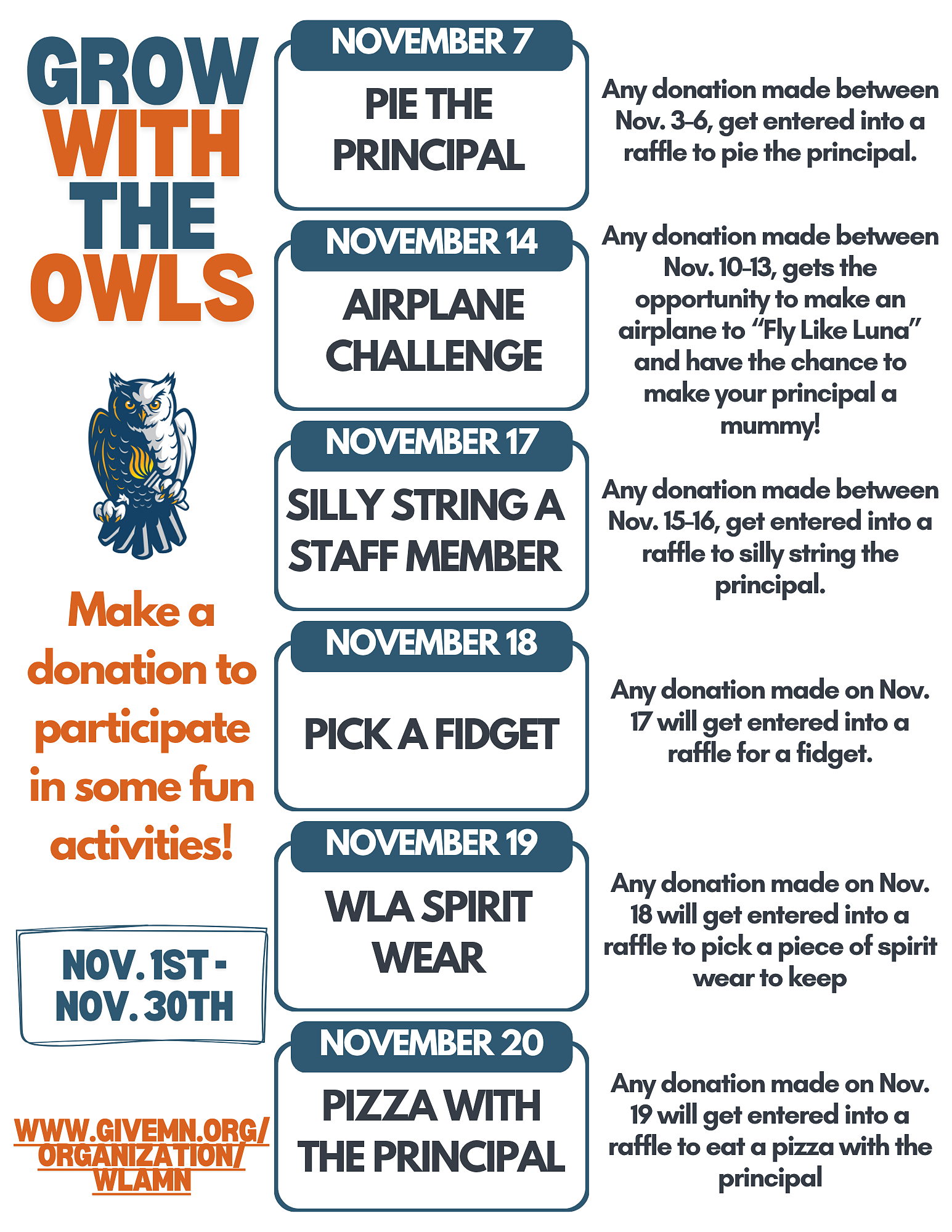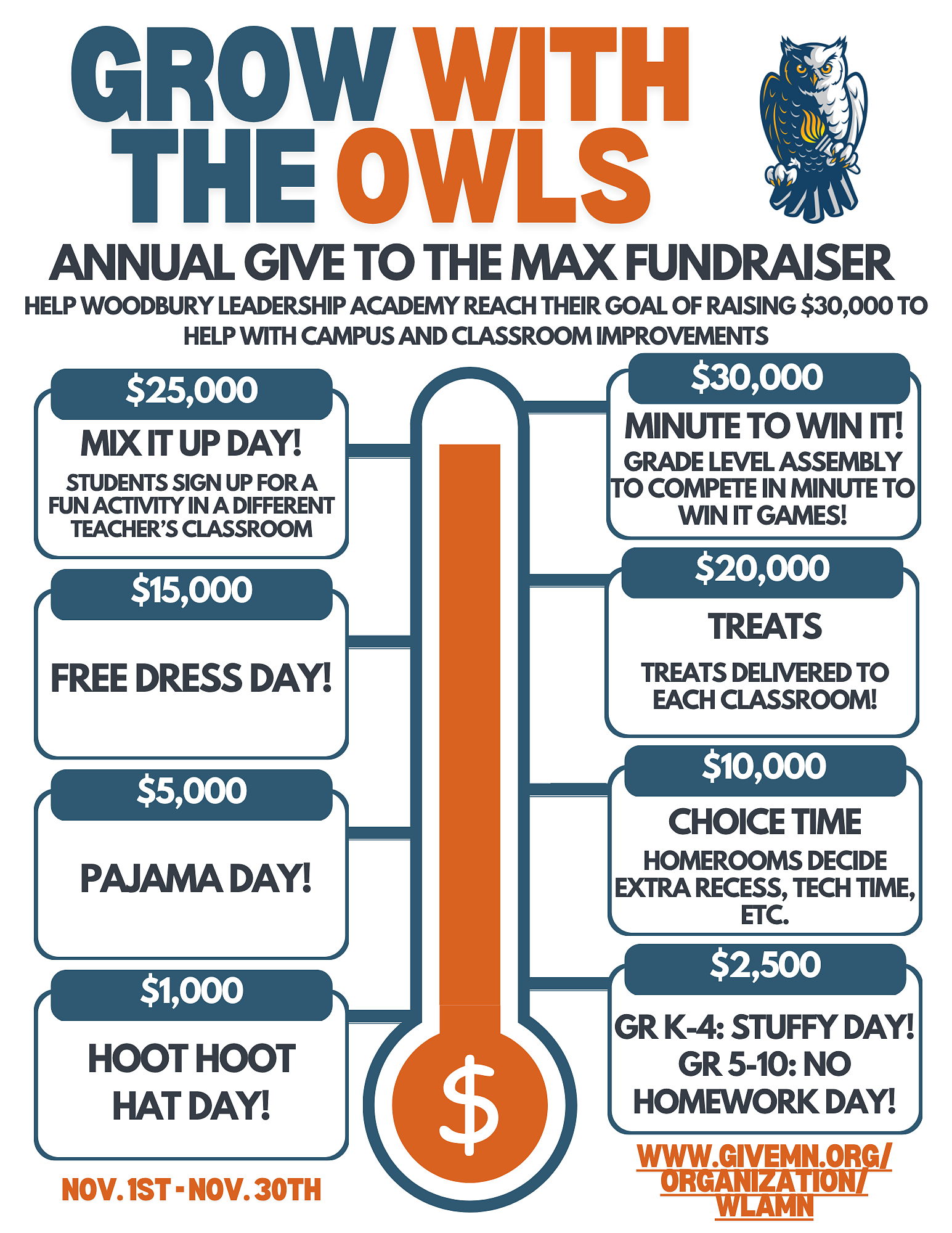 Woodbury Leadership Academy (WLA) is a public nonprofit K-9 charter school located in Woodbury, Minnesota. Charter schools receive approximately $7,000 less per child than traditional public schools in our area. This is why fundraising is so important! Give to the Max provides us a platform to fundraise and keep 100% of the donations!