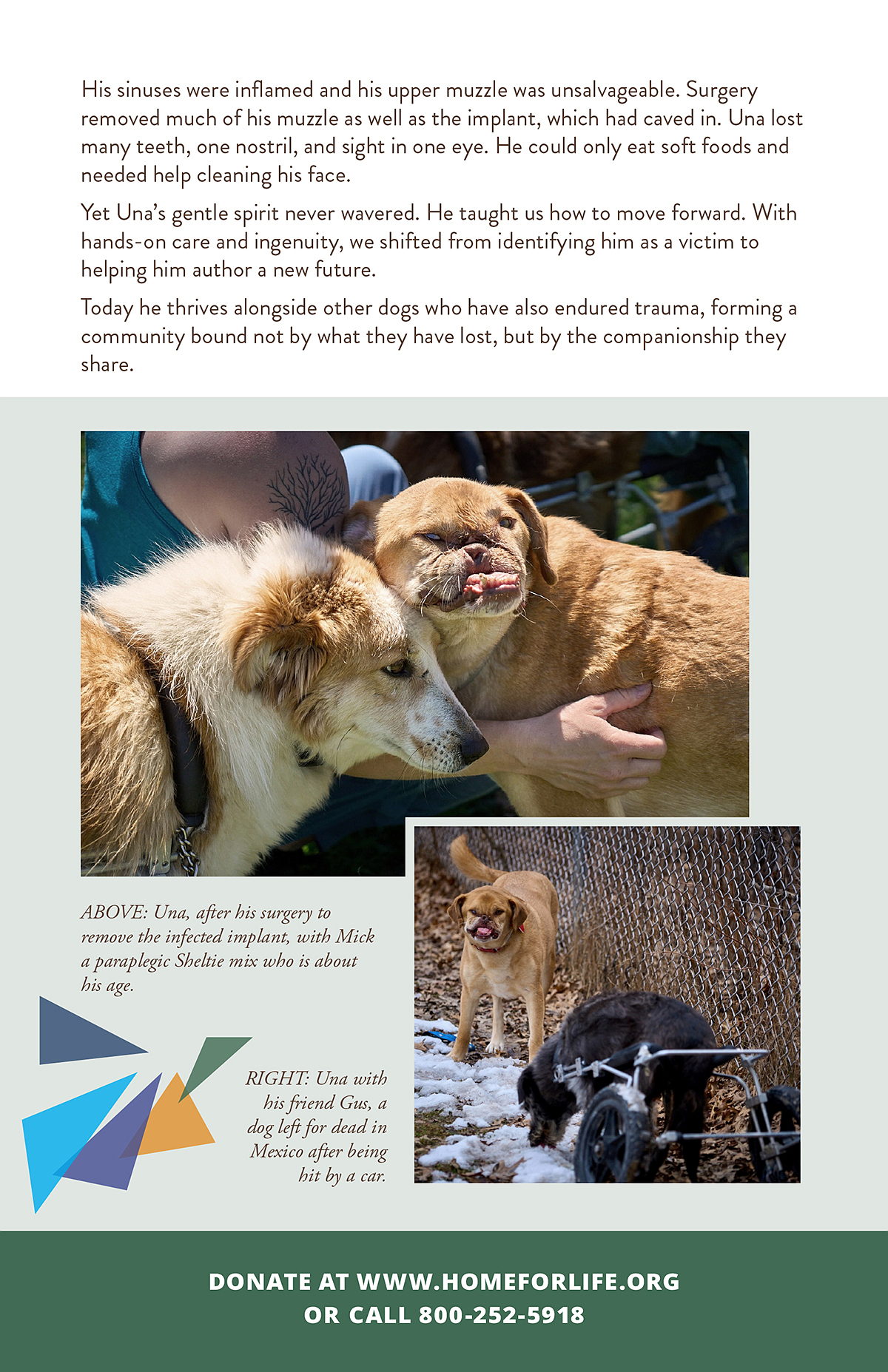 At Home for Life®, we have witnessed that transformation firsthand in animals like Una. His story shows how compassion and creativity can turn cruelty into renewal. Una was born a street dog. At just six months old, he was shot in the face in his home country - veterinarians tried to repair his wound but his injuries just became worse. After reaching Home For Life, Una received care and has become a thriving part of our community. Una’s story proves that compassion and creativity break the cycle of cruelty and indifference to restore a shattered life. Each act of care sets in motion a future that would never otherwise exist. We have seen dogs and cats, once so frightened that they flinch from a touch, learn to trust again; and animals once disfigured by violence discover a new life filled with peace and joy.