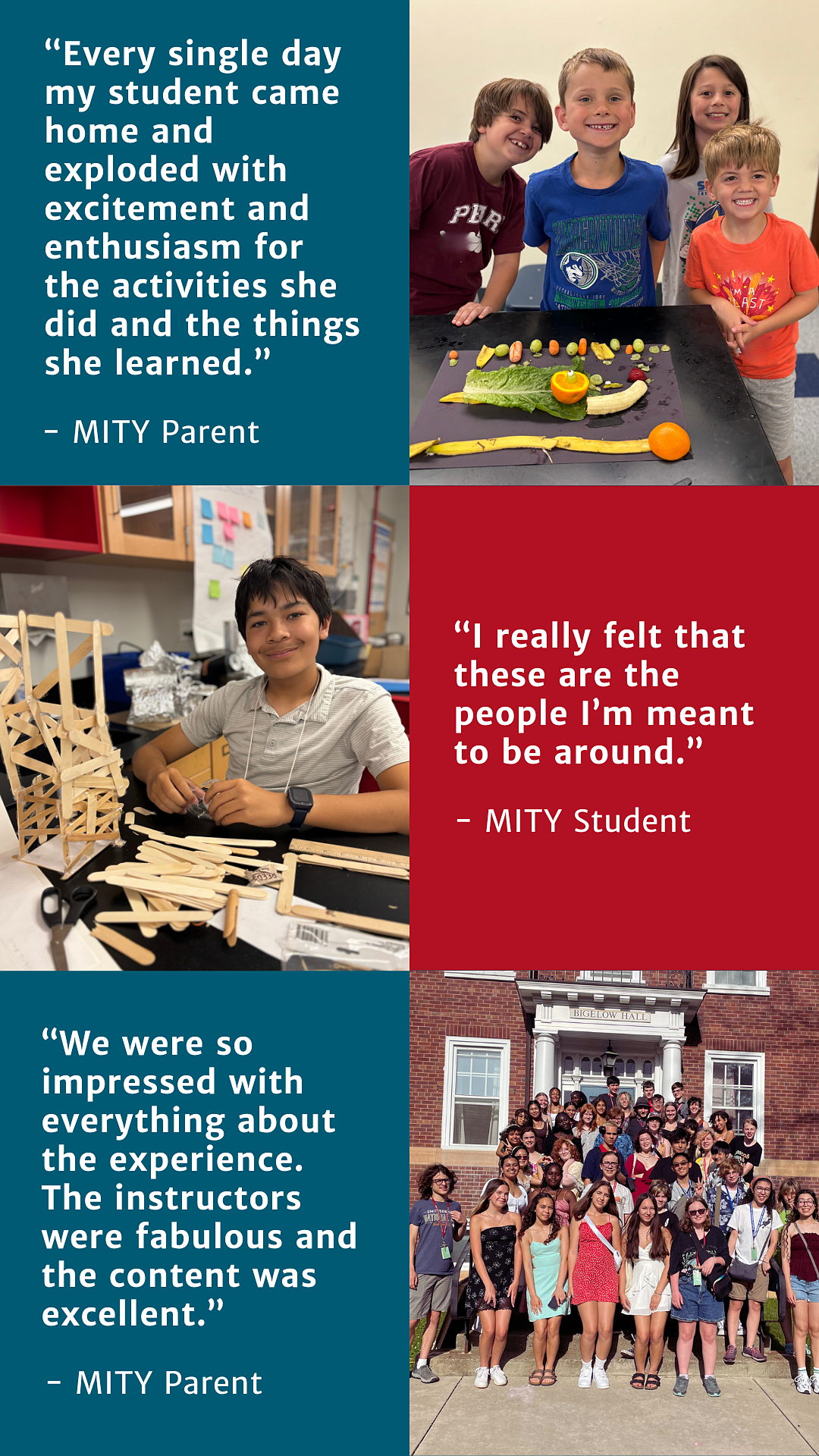 We believe every motivated student deserves a chance to explore their potential, regardless of ability to pay, and are committed to raising financial support to ensure all talented young people can pursue their passions in a safe environment. MITY's goal is to meet the financial need of all qualified applicants. Please consider giving to help more young people explore their potential. 100% of your tax-deductible gift goes to student scholarships! Your gift can change a young perons's life.