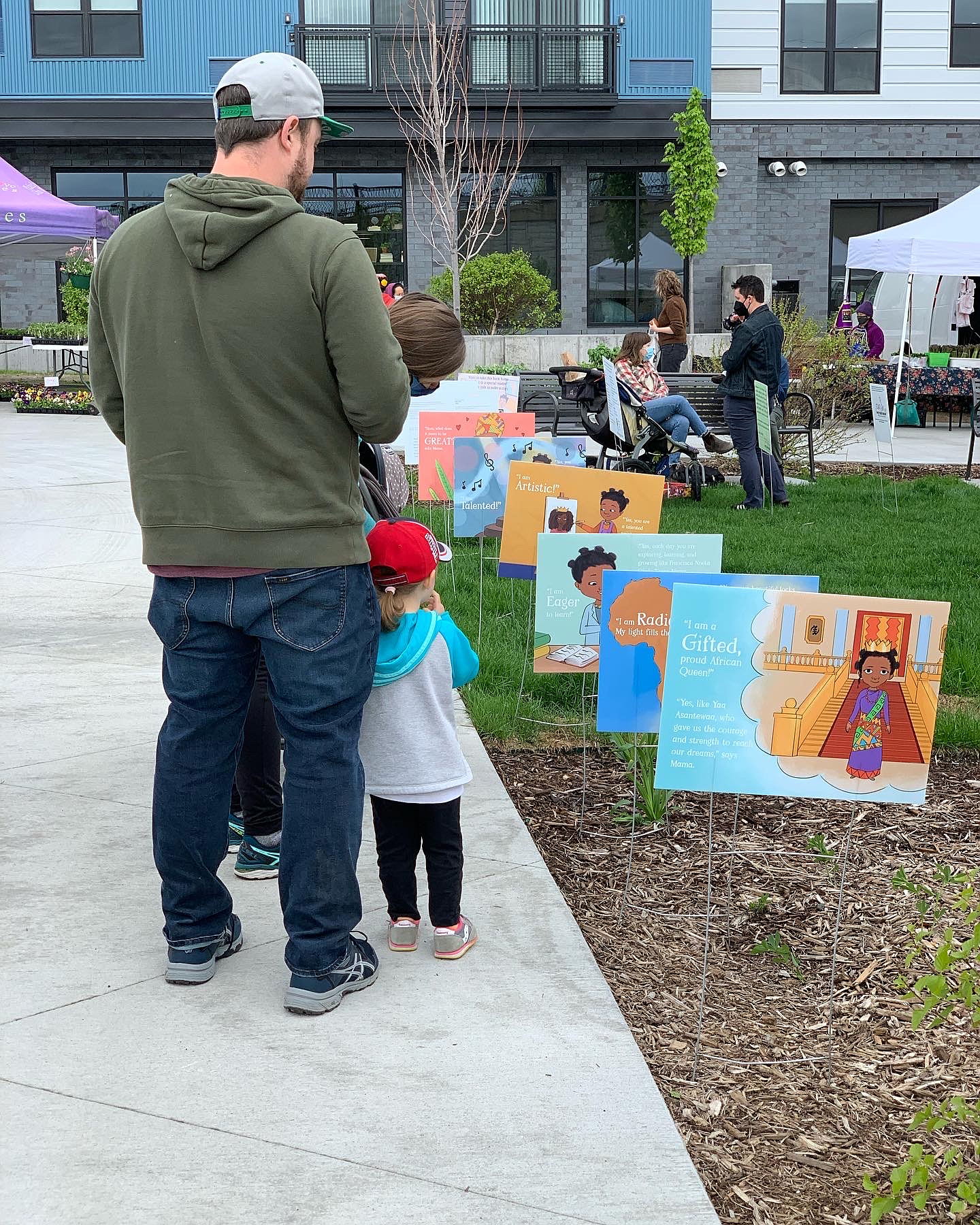 Our story strolls also serve as larger-than-life book promotions for local authors and illustrators. They end with QR codes so readers can buy the books online. Artists are invited to visit with families and to read their books during storytime. They can keep their exhibits for future strolls.