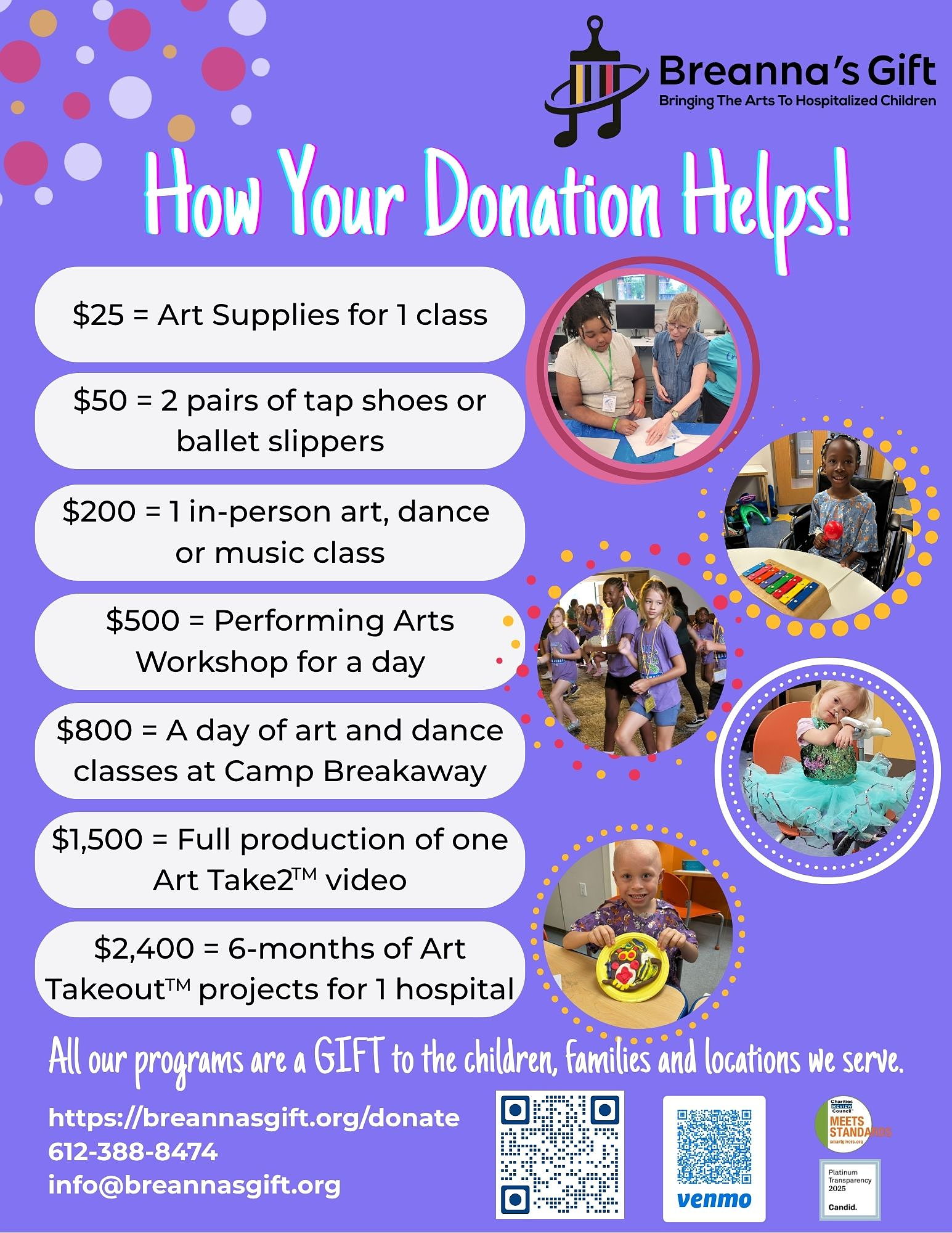 Breanna’s Gift provides dance, visual arts, music and performing arts opportunities at children's hospitals and healthcare facilities. All programs are free to children, their families, and the facilities we serve. We cover all program costs, including teachers' compensation, costumes, dance shoes and supplies needed for art, music and performing arts. And the results – from the children, their families and everyone associated with Breanna's Gift – are SMILES!
