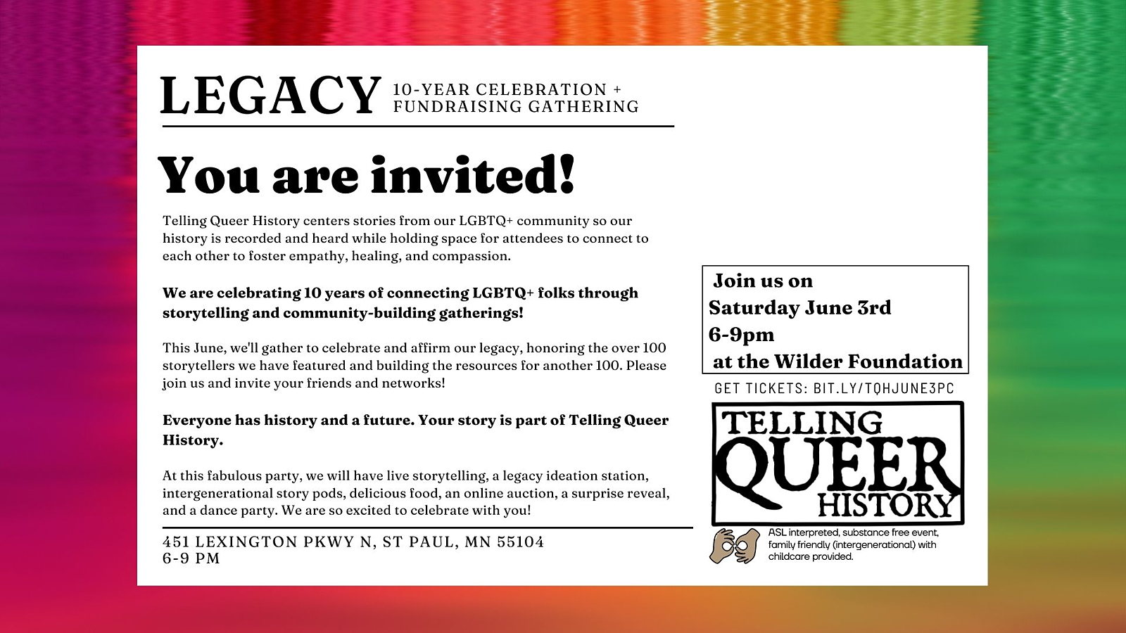 On June 3rd, 2023, Telling Queer History is celebrating 10 years of gatherings and having featured over 100 storytellers. Help us celebrate and grow by inviting your friends to join us as attendees, donors, and volunteers.