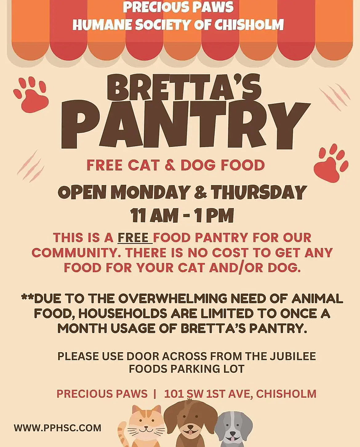 Bretta's Pantry was introduced in November of 2023.Bretta's Pantry provides families with food to get by for a few days- until they can go shopping. Each family will receive cat and/or dog food items that will last them a few days- enough to get by until they can go shopping. We all have been there a time or two when we have to figure out how to stretch that dollar until payday. We don't want anyone to have to decide between buying their own food or their animals' food.