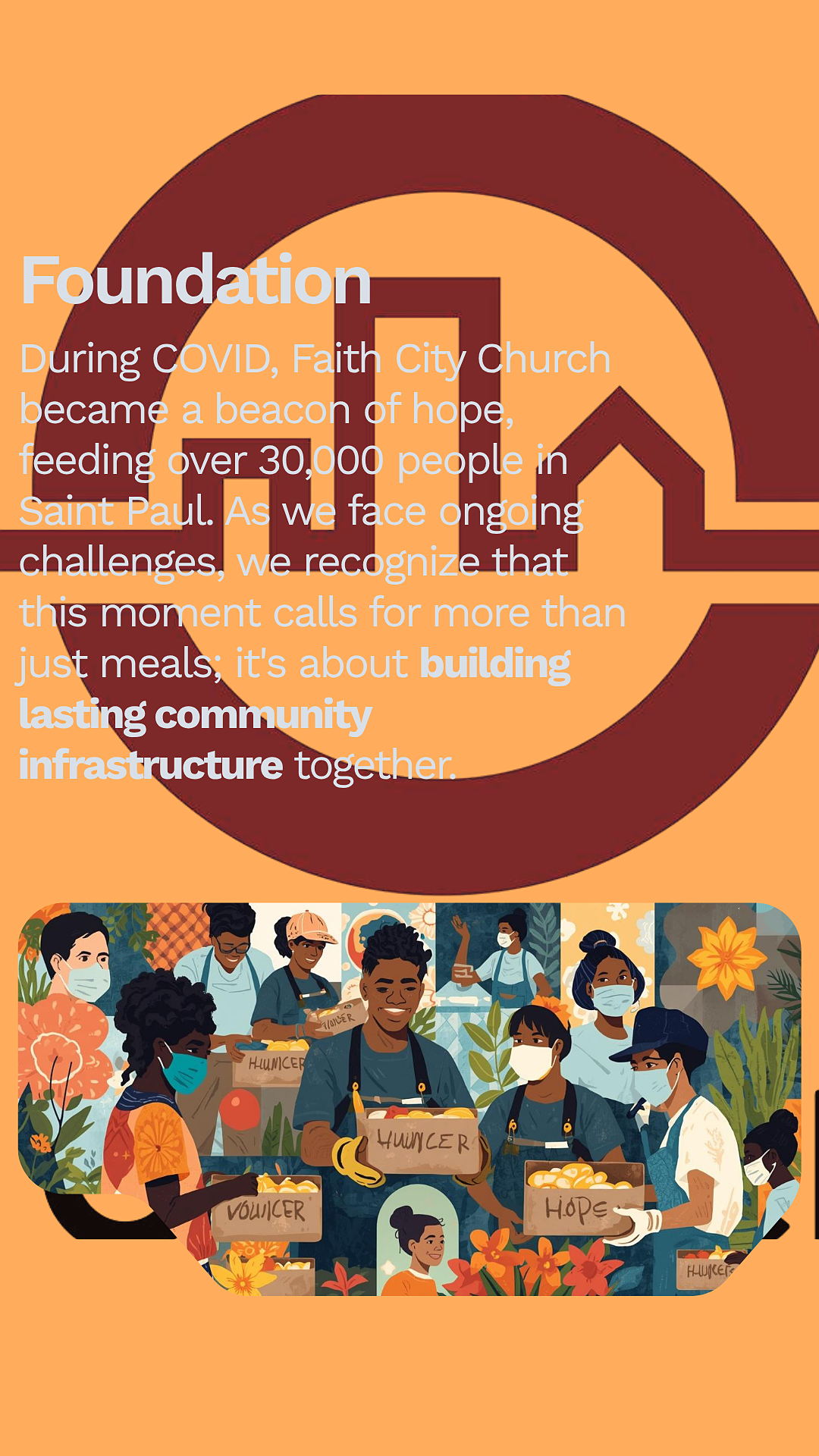 During the pandemic, we came together as a small team with a big mission — to make sure no one went hungry. From May 2020 to June 2022, Faith City Church and our partners helped provide over 30,000 meals across Saint Paul. We mobilized four churches as food hubs, rallied caterers and volunteers, and served families from Eastside to Rondo — no sign-ups, no conditions, just justice and grace.