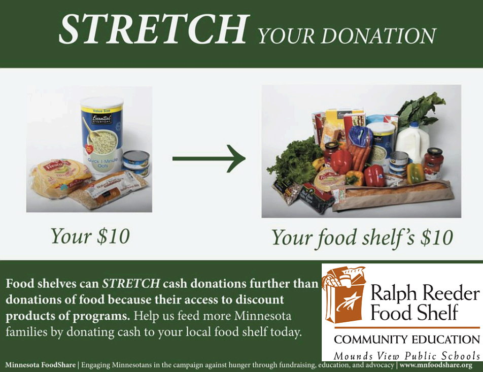 It's the time of year when we come together to support one of Mounds View's most valuable organizations. The Ralph Reeder Food Shelf is an important resource in our community, and their impact is especially great right here at Pinewood. Becasue of the food shelf's reliability, consistency, and generosity, Pinewood is able to: